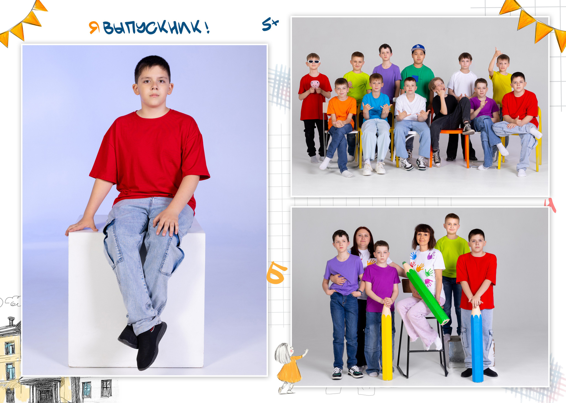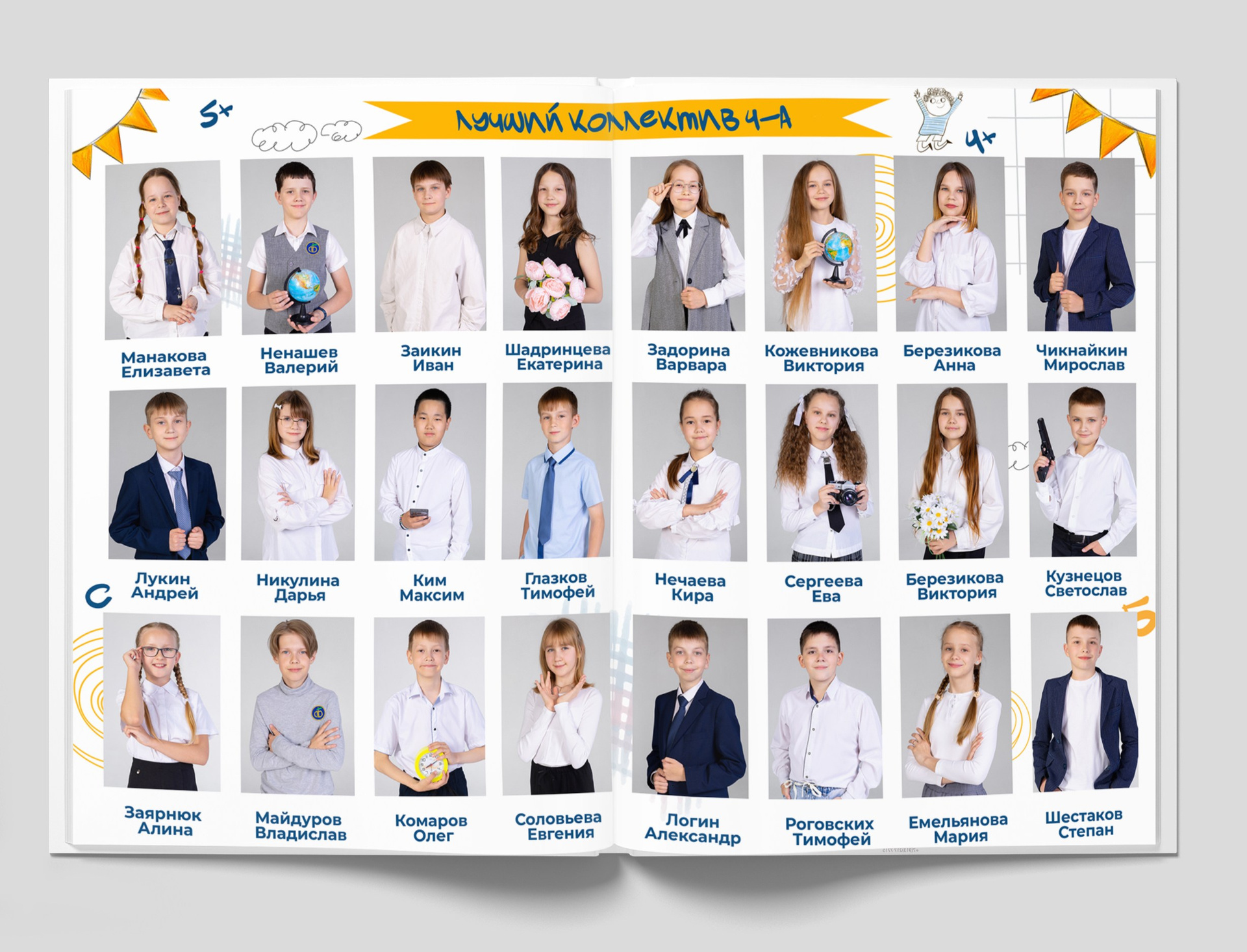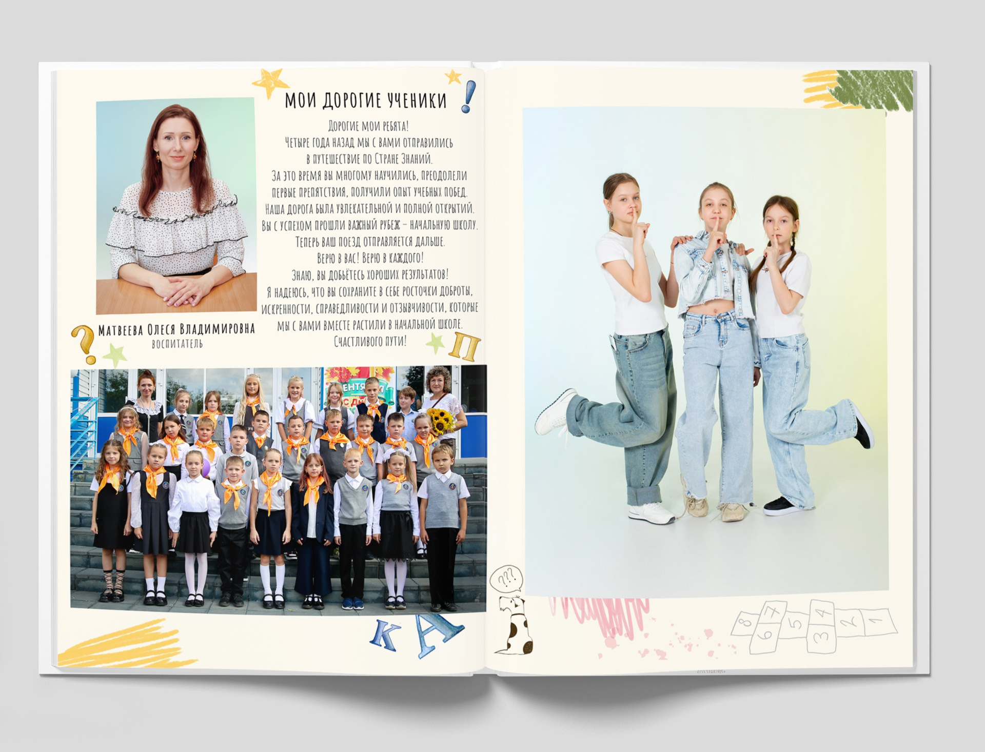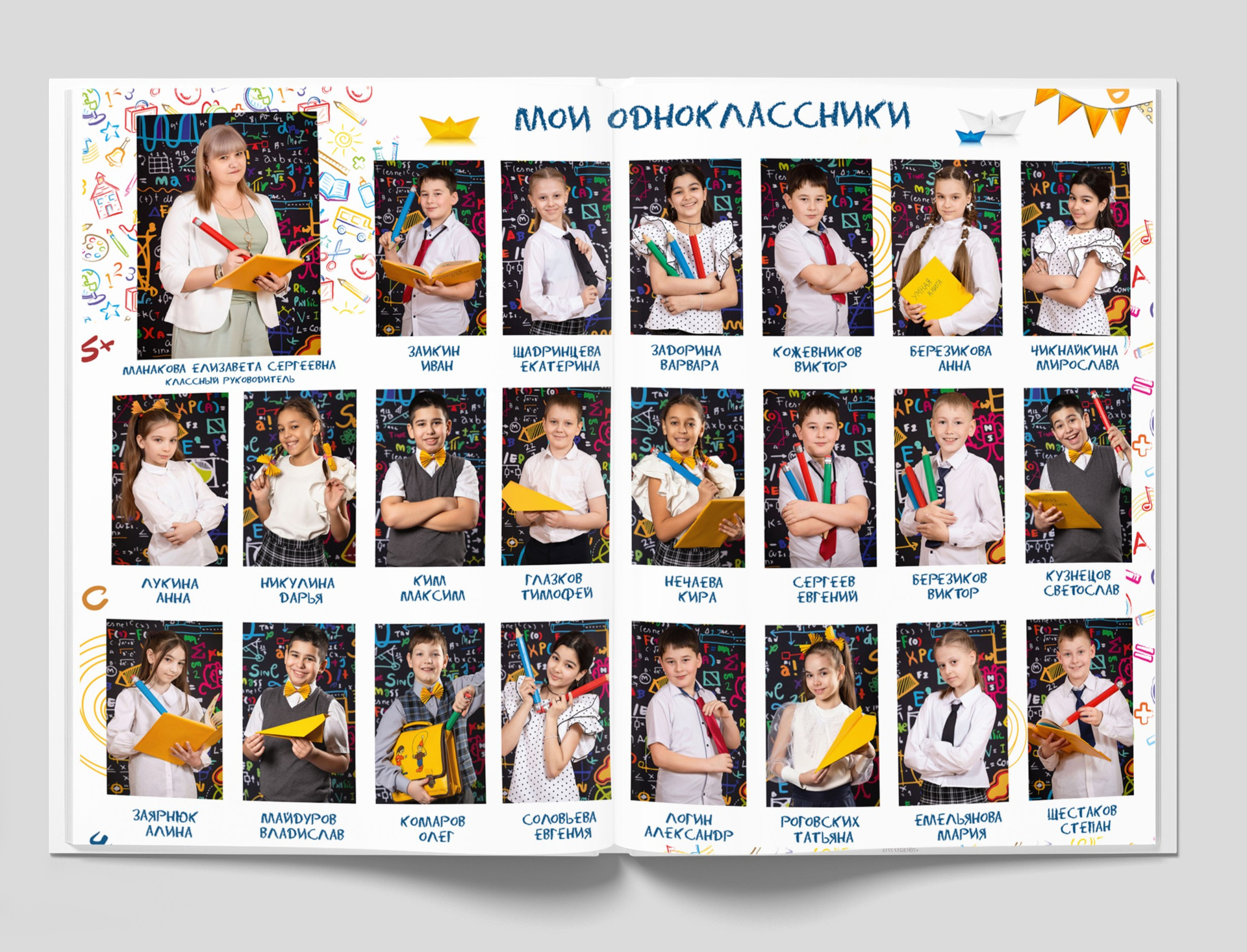 1 разворот: индивидуальная фотография ребенка в компании лучших друзей, общая фотография класса с прошлых лет (это может быть фото с 1 класса или с 1 сентября текущего года) + портрет педагога (педагогов).