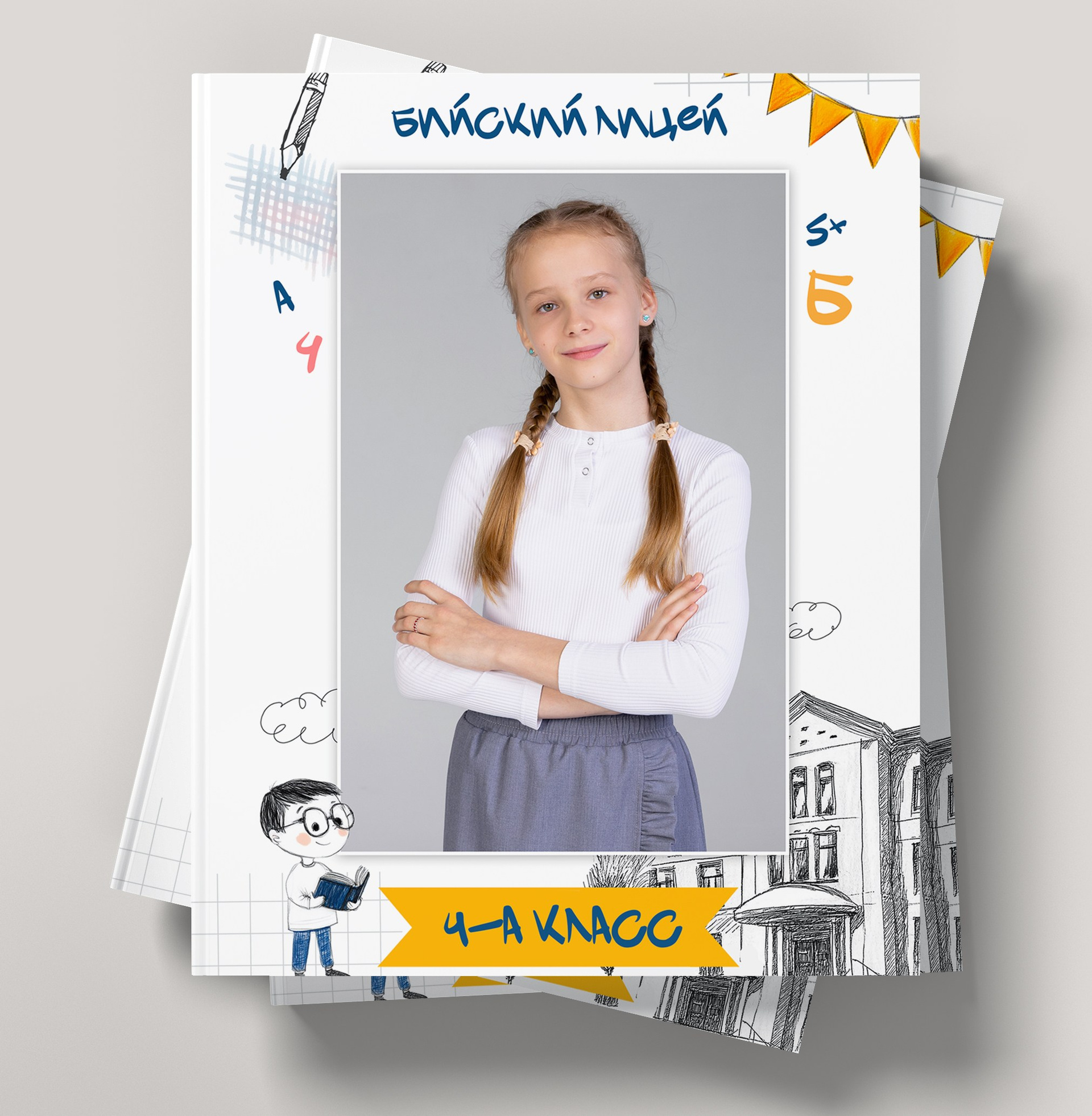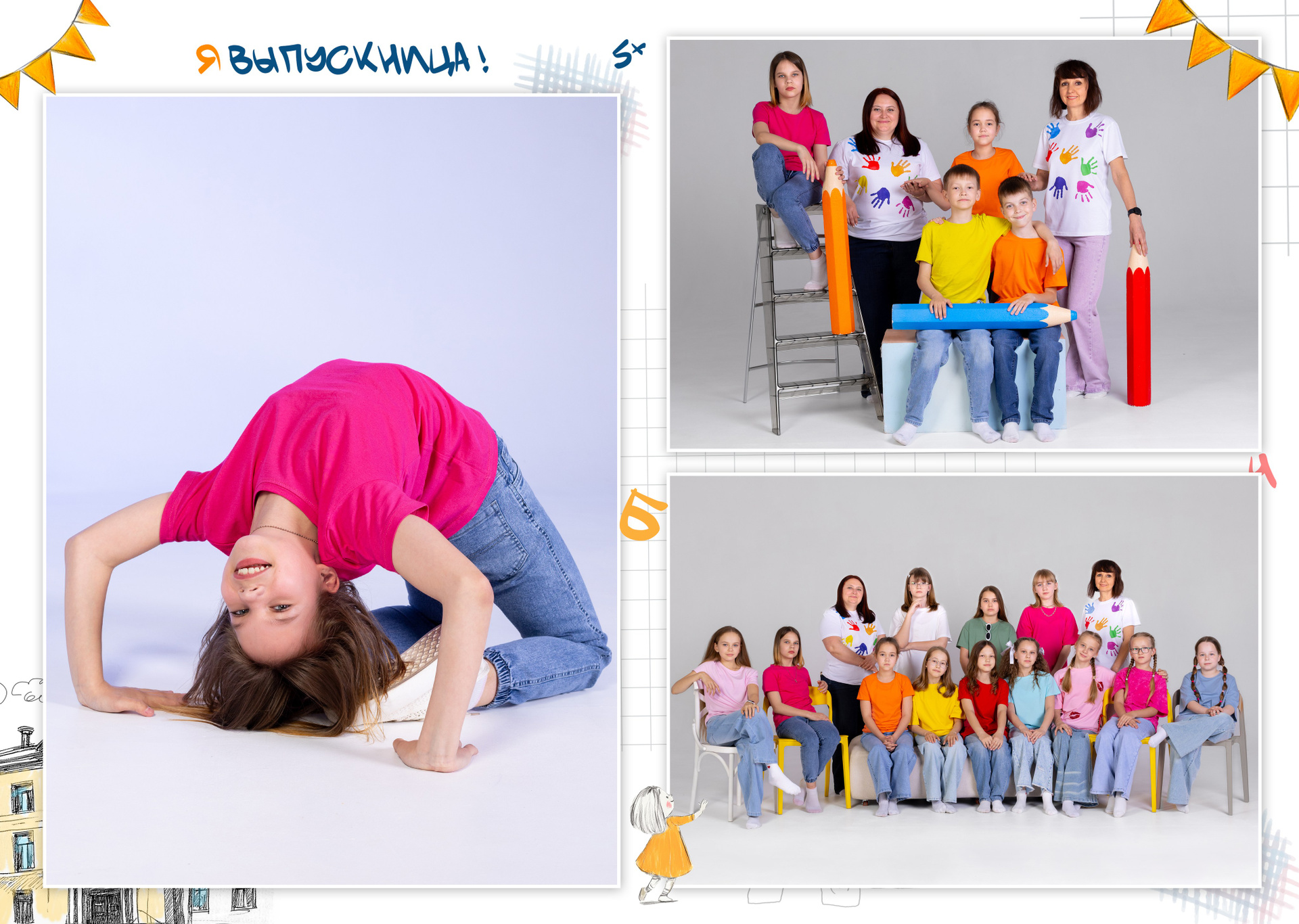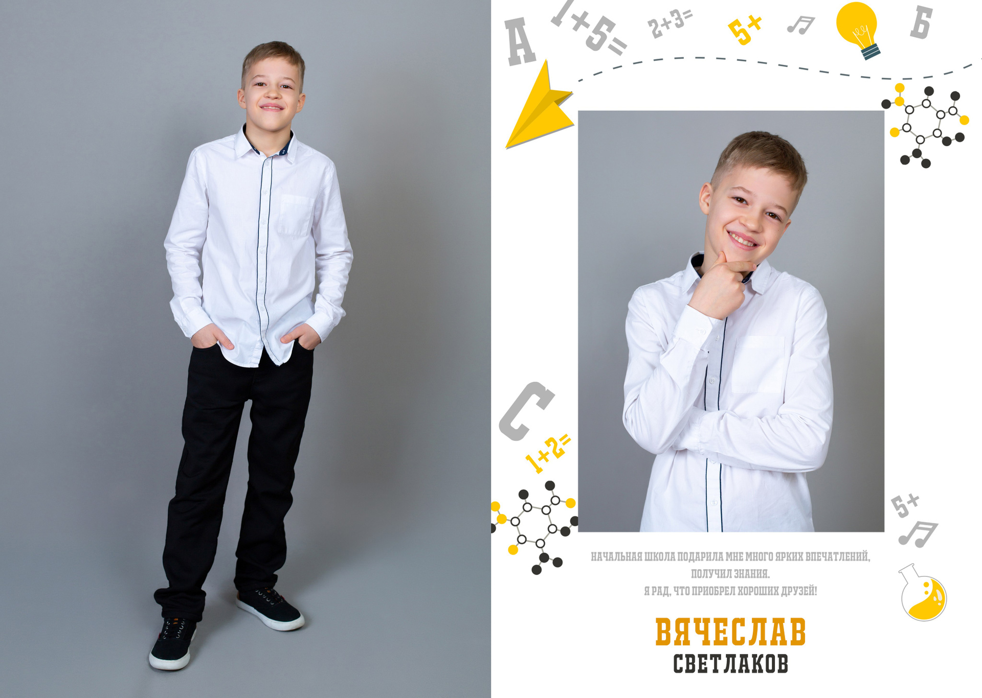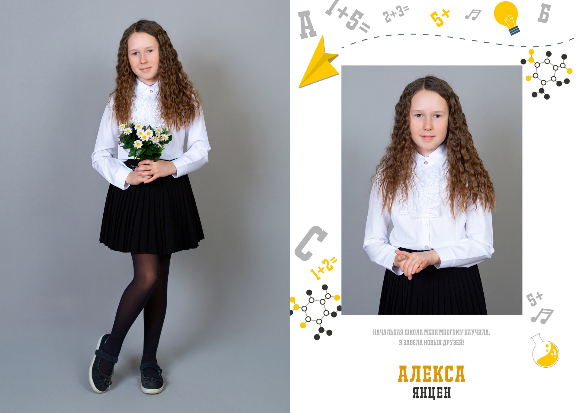 1 разворот: индивидуальная фотография ребенка в компании лучших друзей, общая фотография класса с прошлых лет (это может быть фото с 1 класса или с 1 сентября текущего года) + портрет педагога (педагогов).
