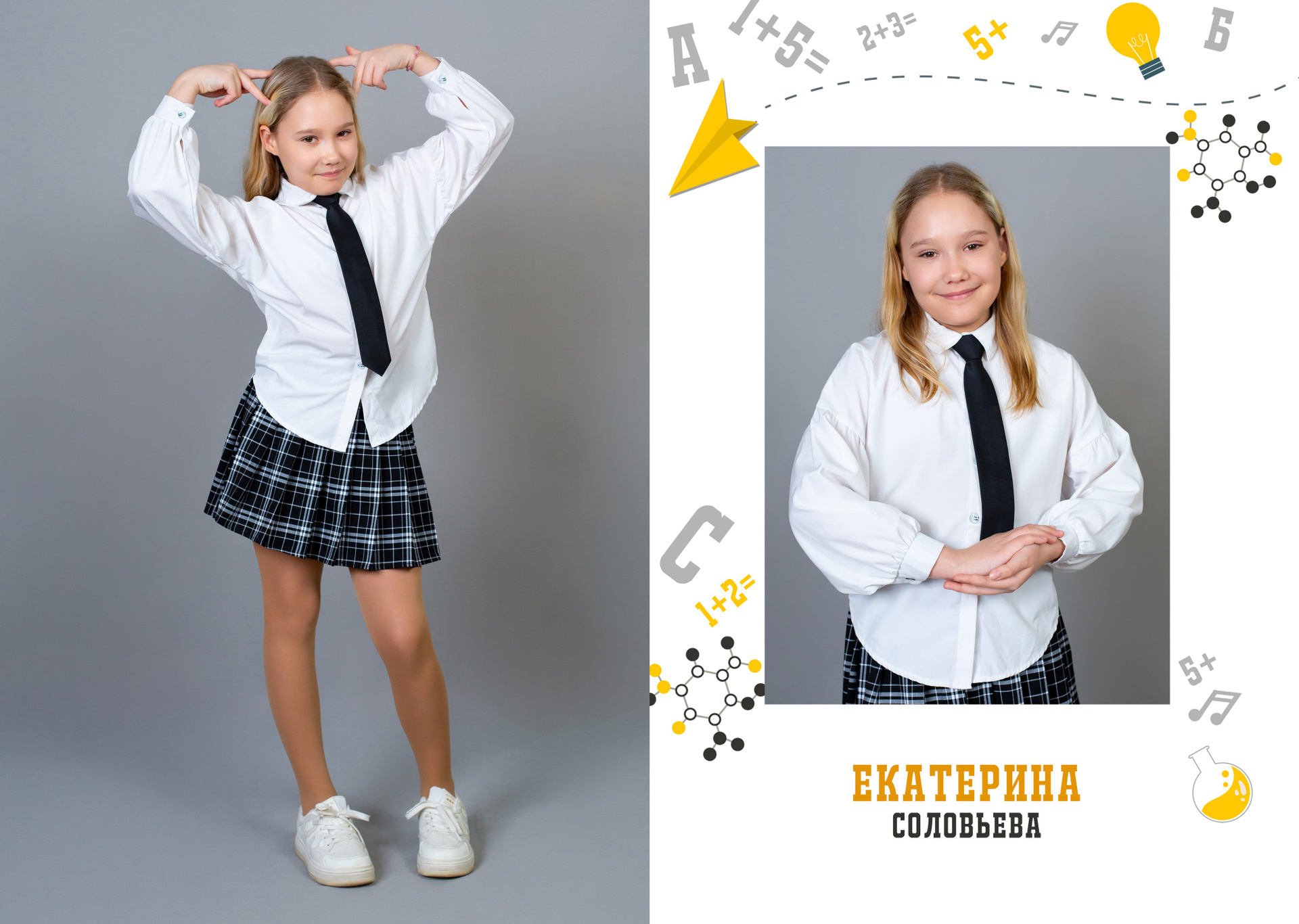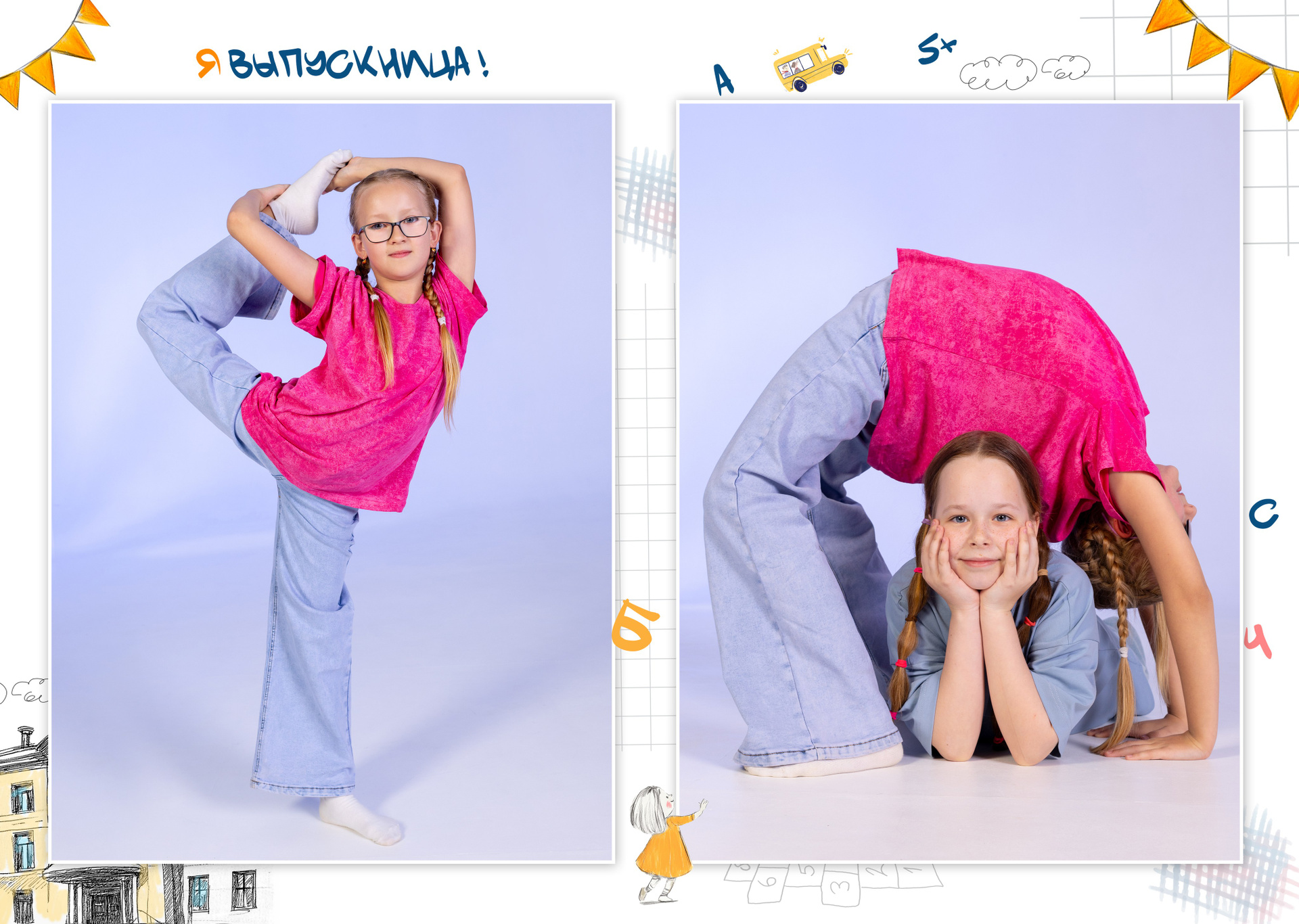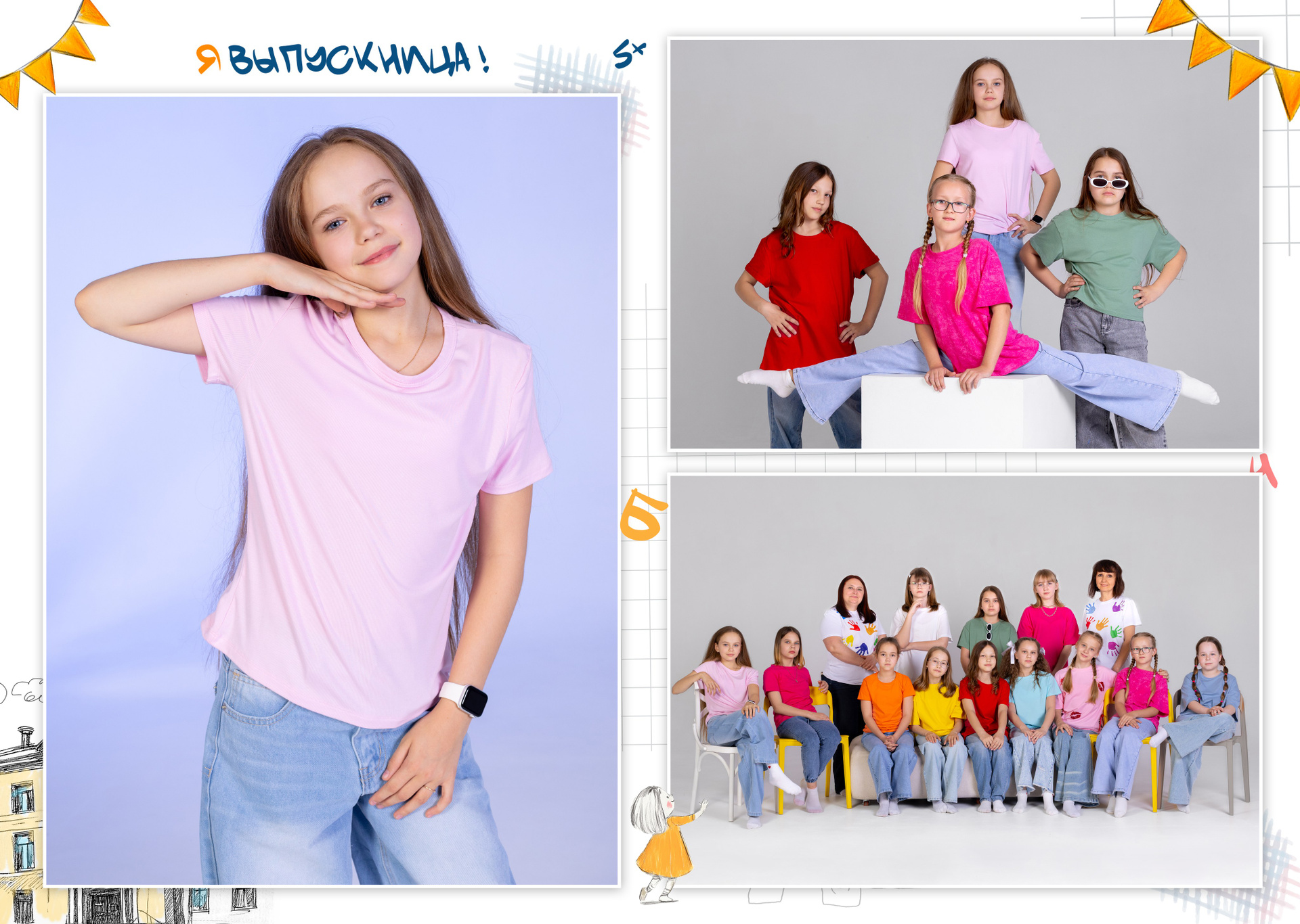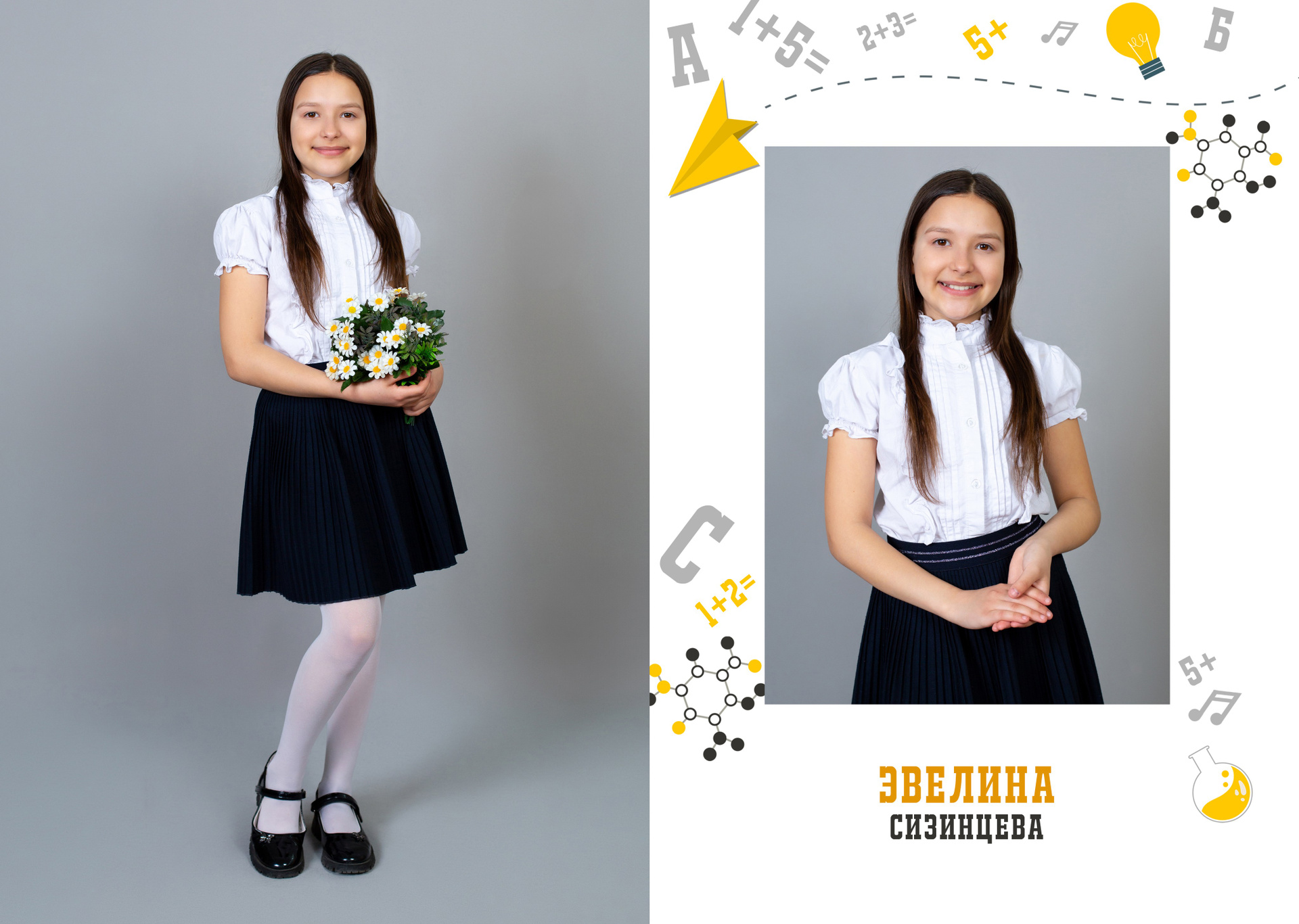 1 разворот: индивидуальная фотография ребенка в компании лучших друзей, общая фотография класса с прошлых лет (это может быть фото с 1 класса или с 1 сентября текущего года) + портрет педагога (педагогов).