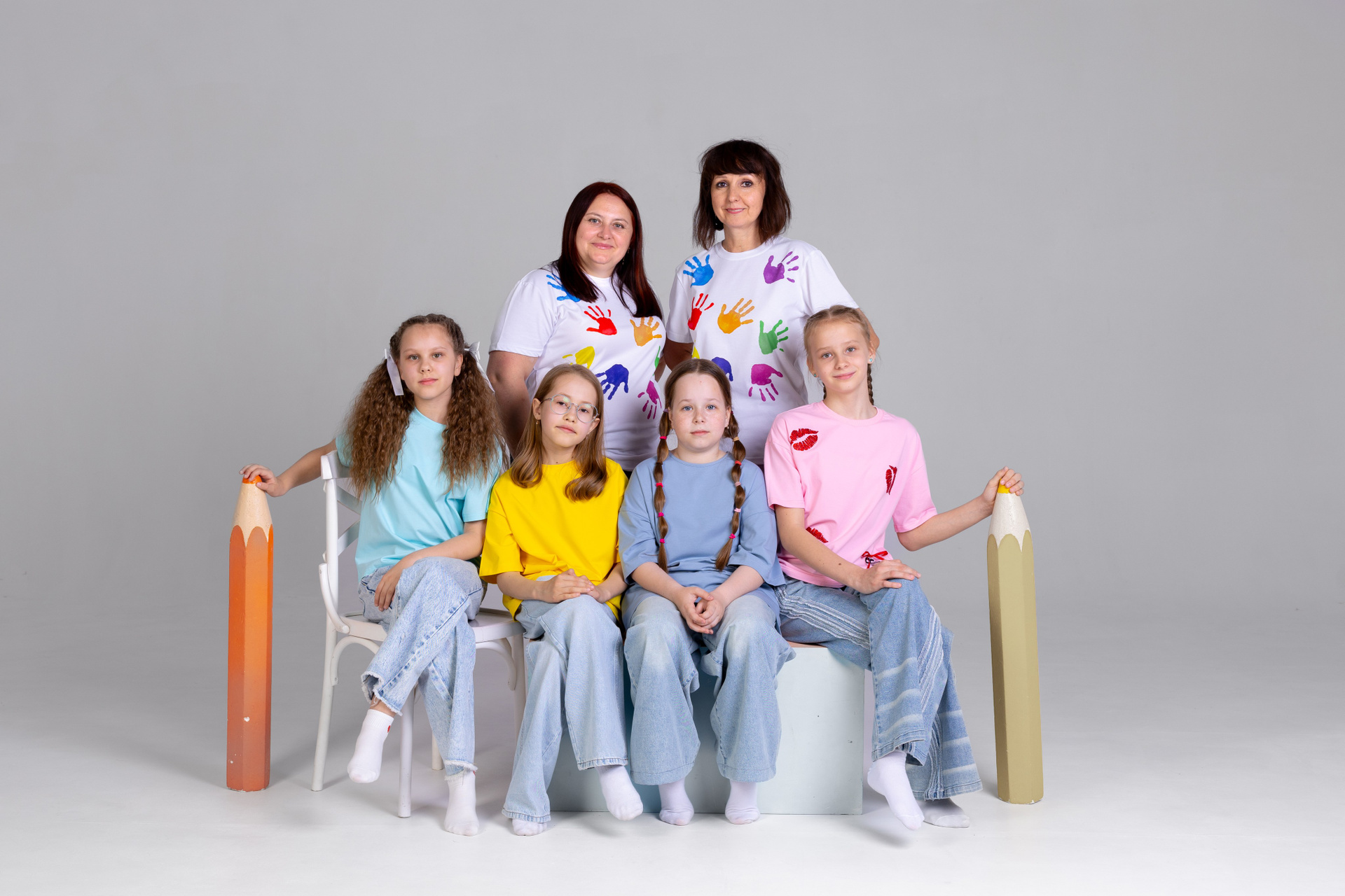 Реквизит, который вы видите на фотографиях — наш. Мы привозим с собой все, что необходимо для реализации проекта: карандаши большие и маленькие, кубики всех размеров, книги, цветы, глобусы, костюмы ученых (мантии + конфедератки) и т. д.