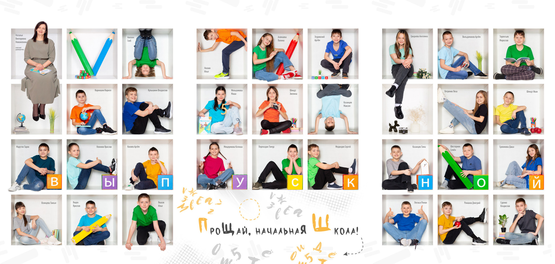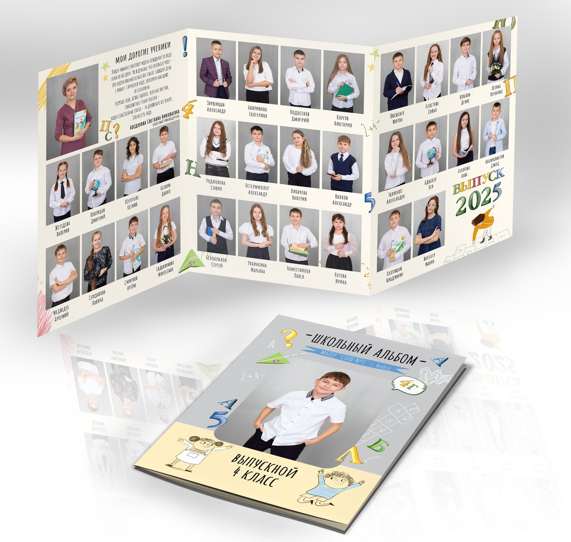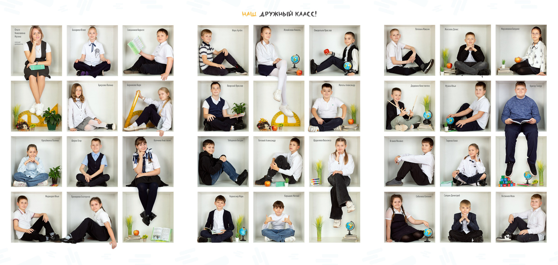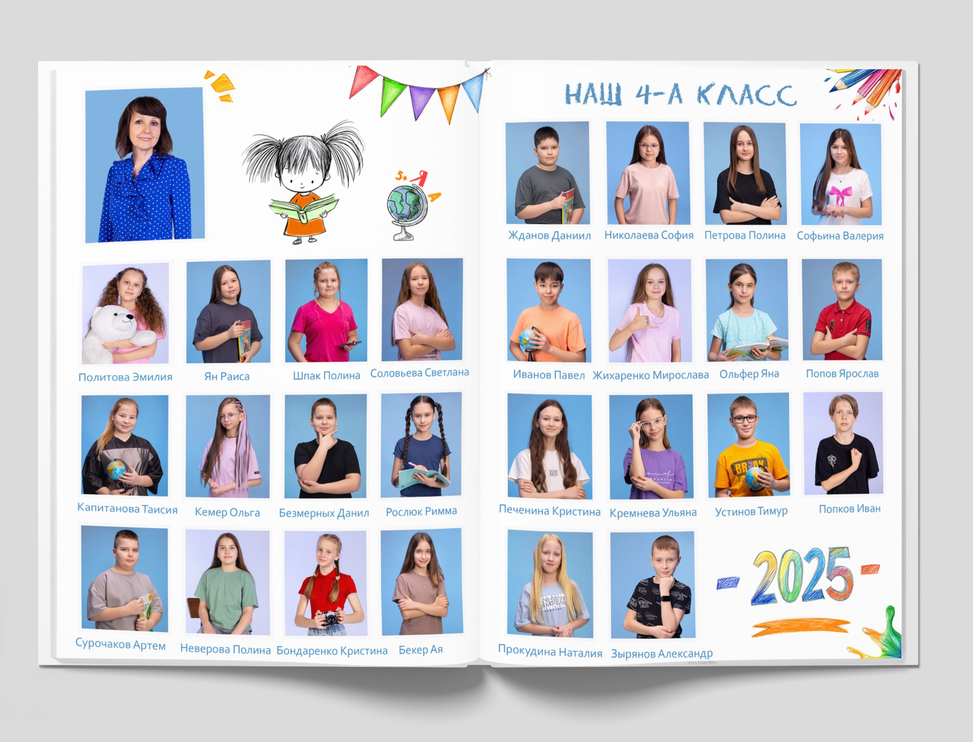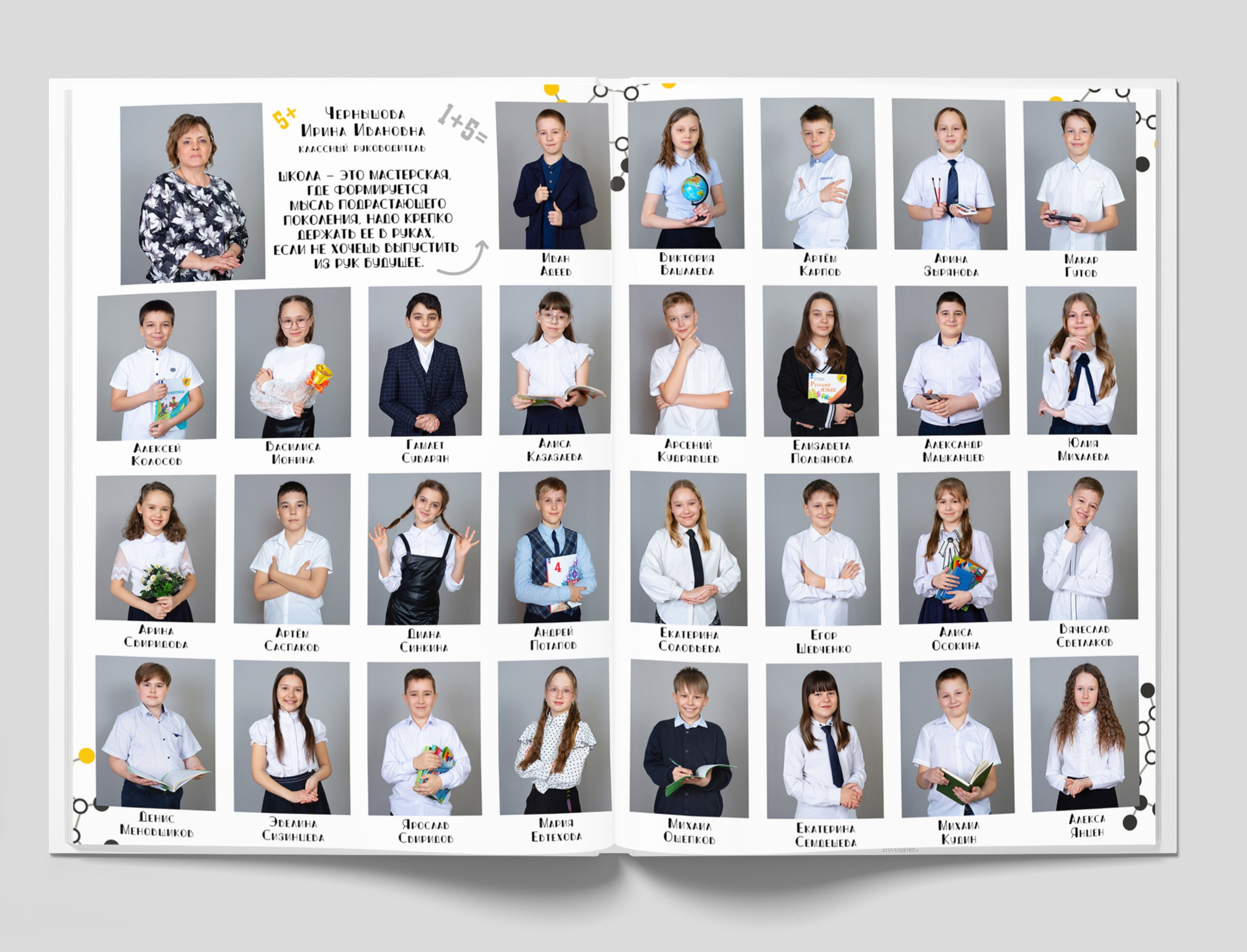 2 разворот: Виньетка — одноклассники портретно, подписаны по фамилии и имени + портрет педагога