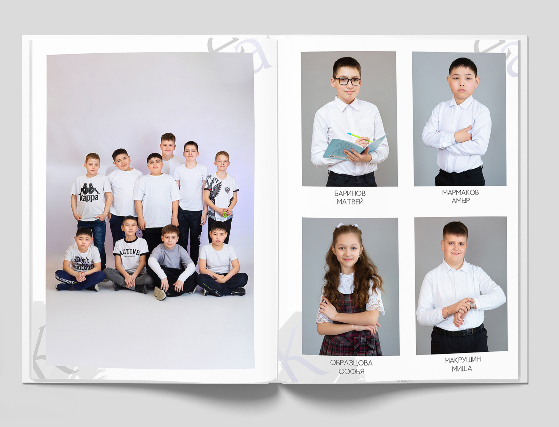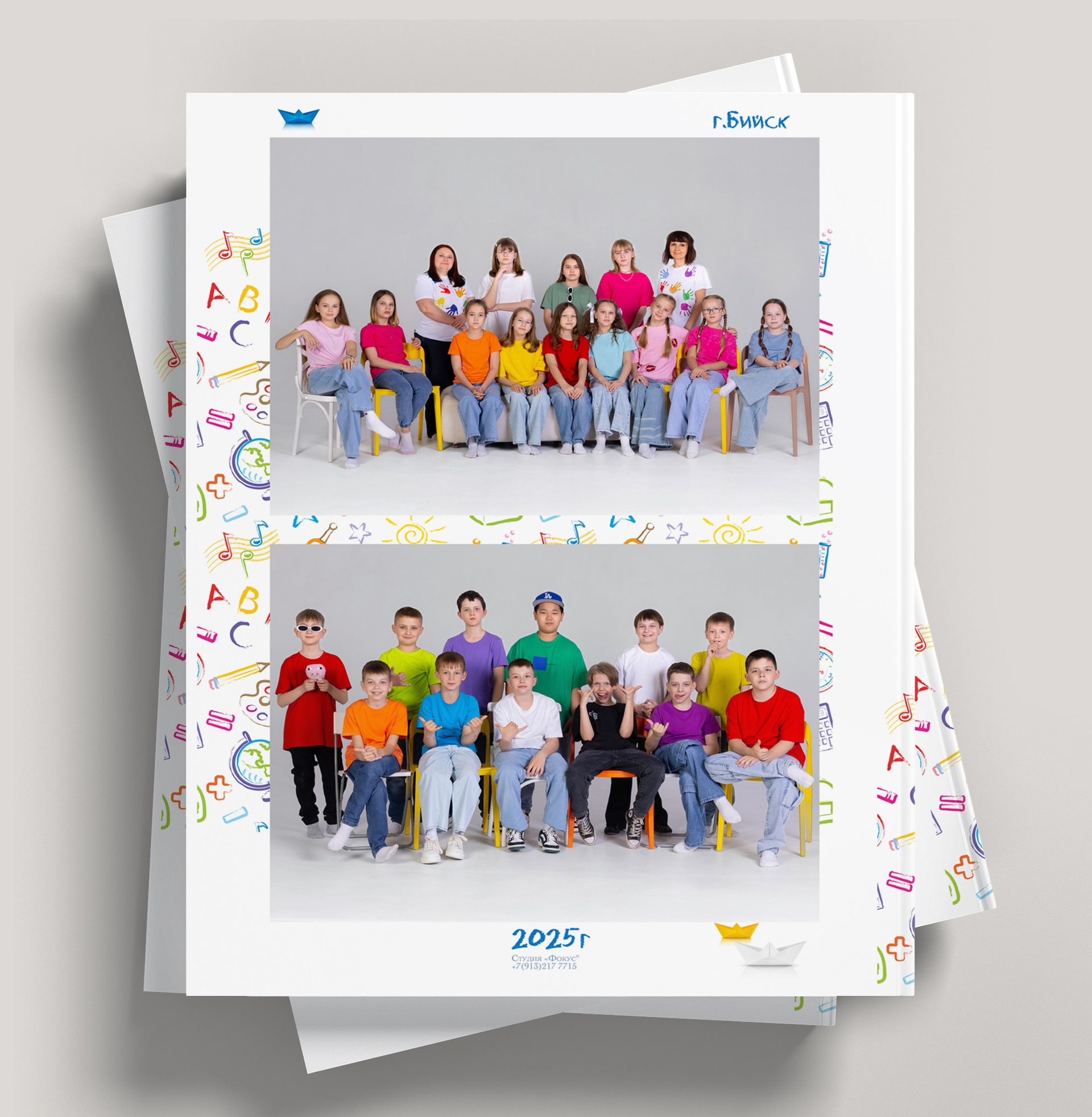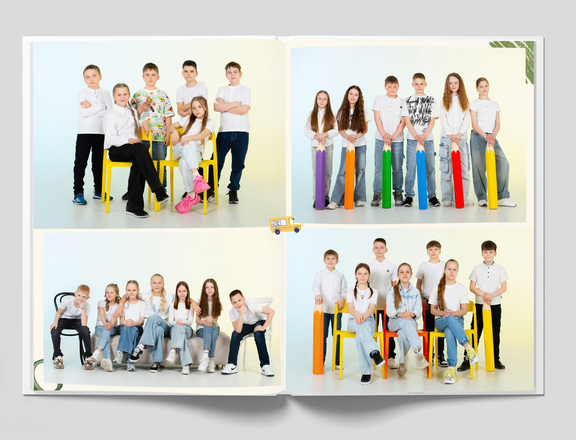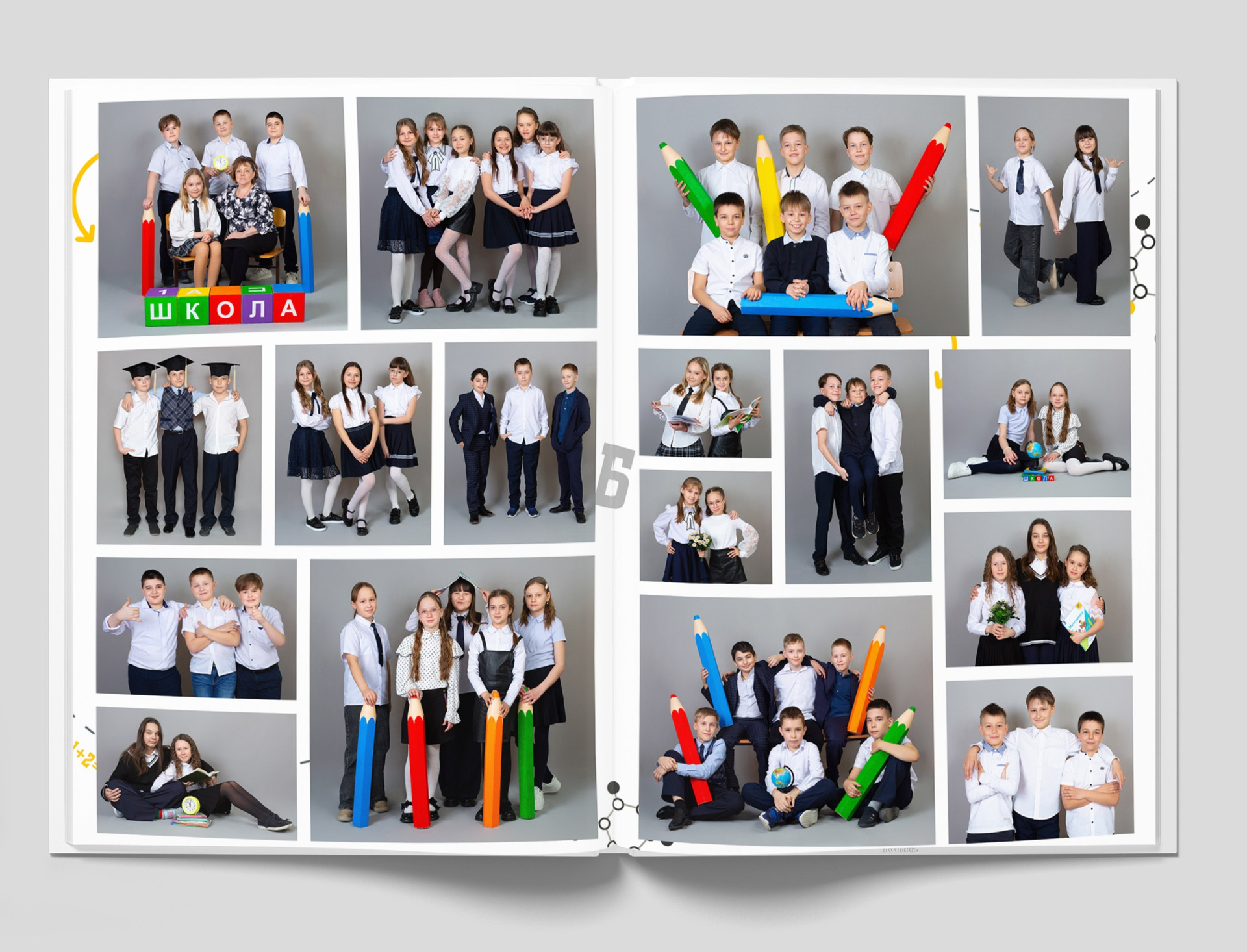 Все внутренние развороты оформлены портретами детей класса с подписью имен + коллажи фотографий сюжетов, снятых на студийной фотозоне, в студии или прямо в классе.