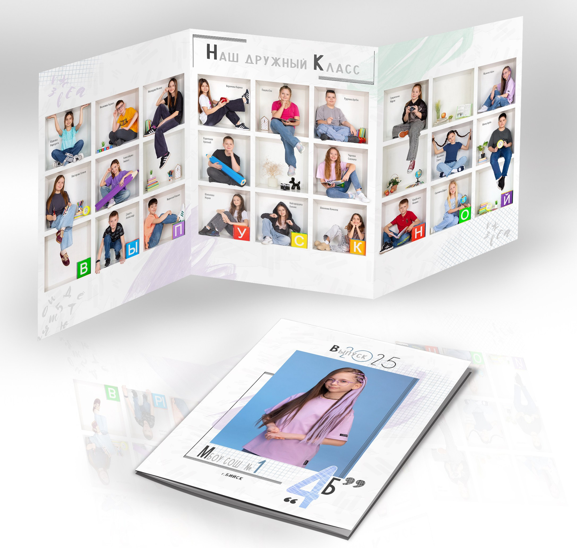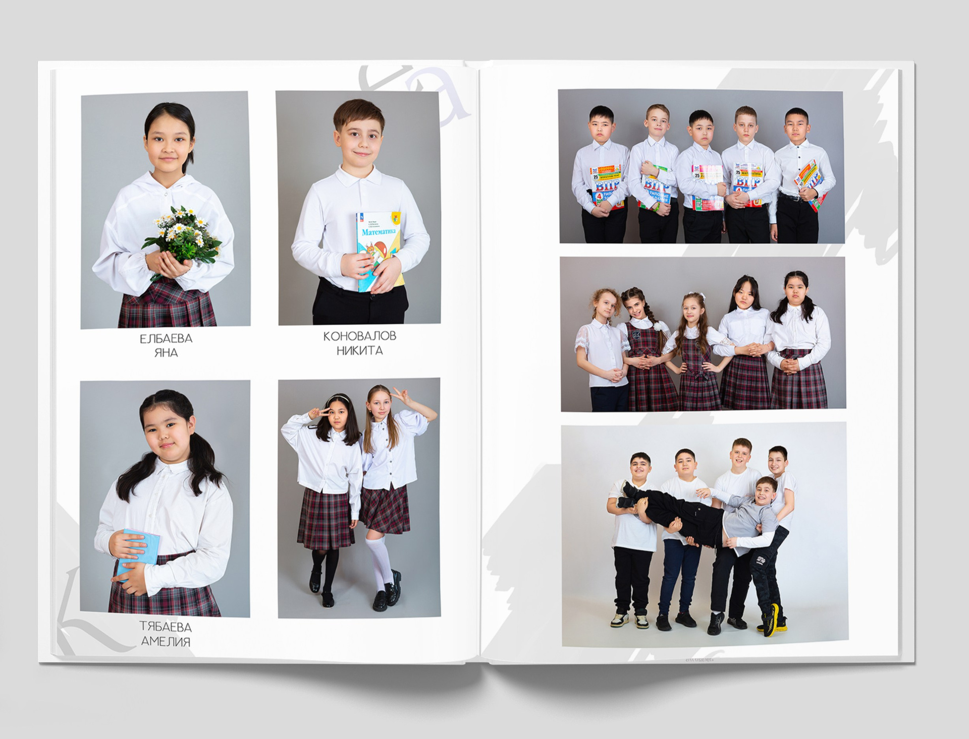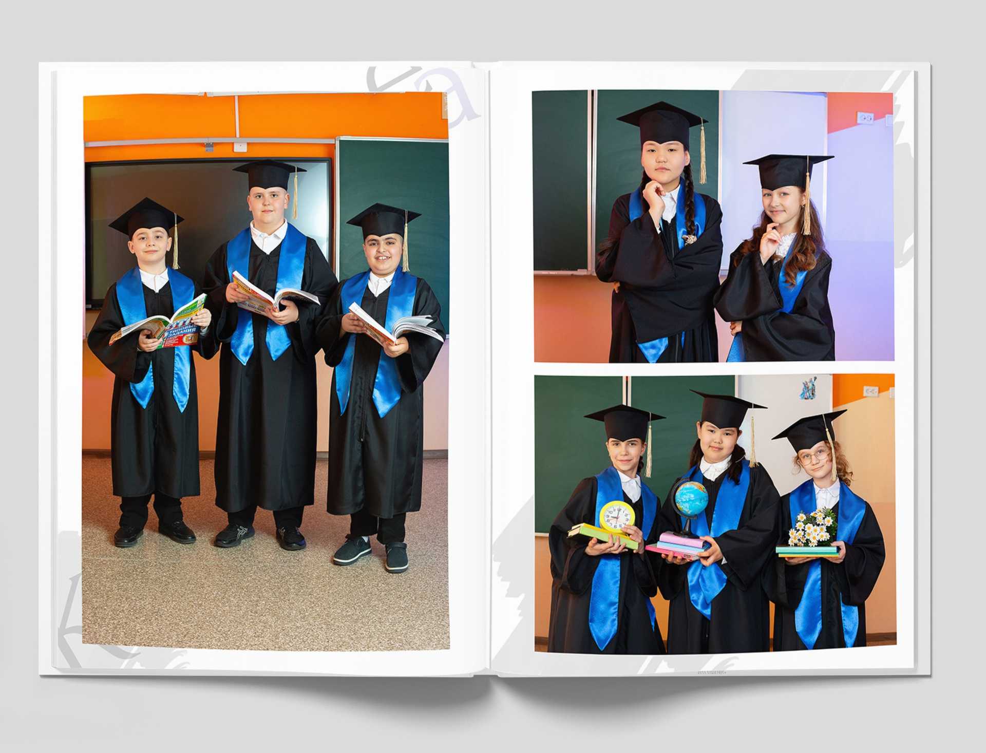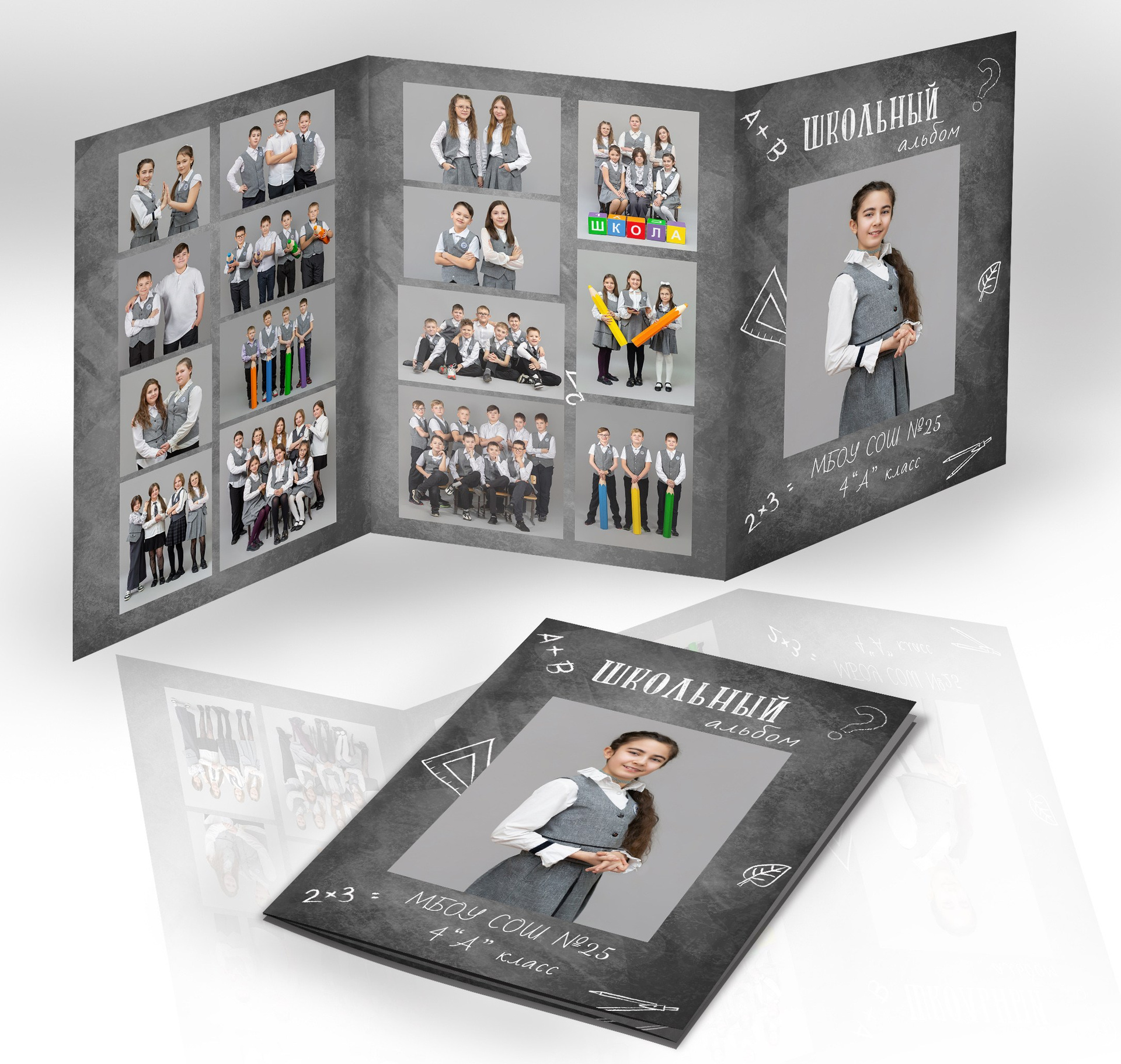 Все внутренние развороты оформлены портретами детей класса с подписью имен + коллажи фотографий сюжетов, снятых на студийной фотозоне, в студии или прямо в классе.