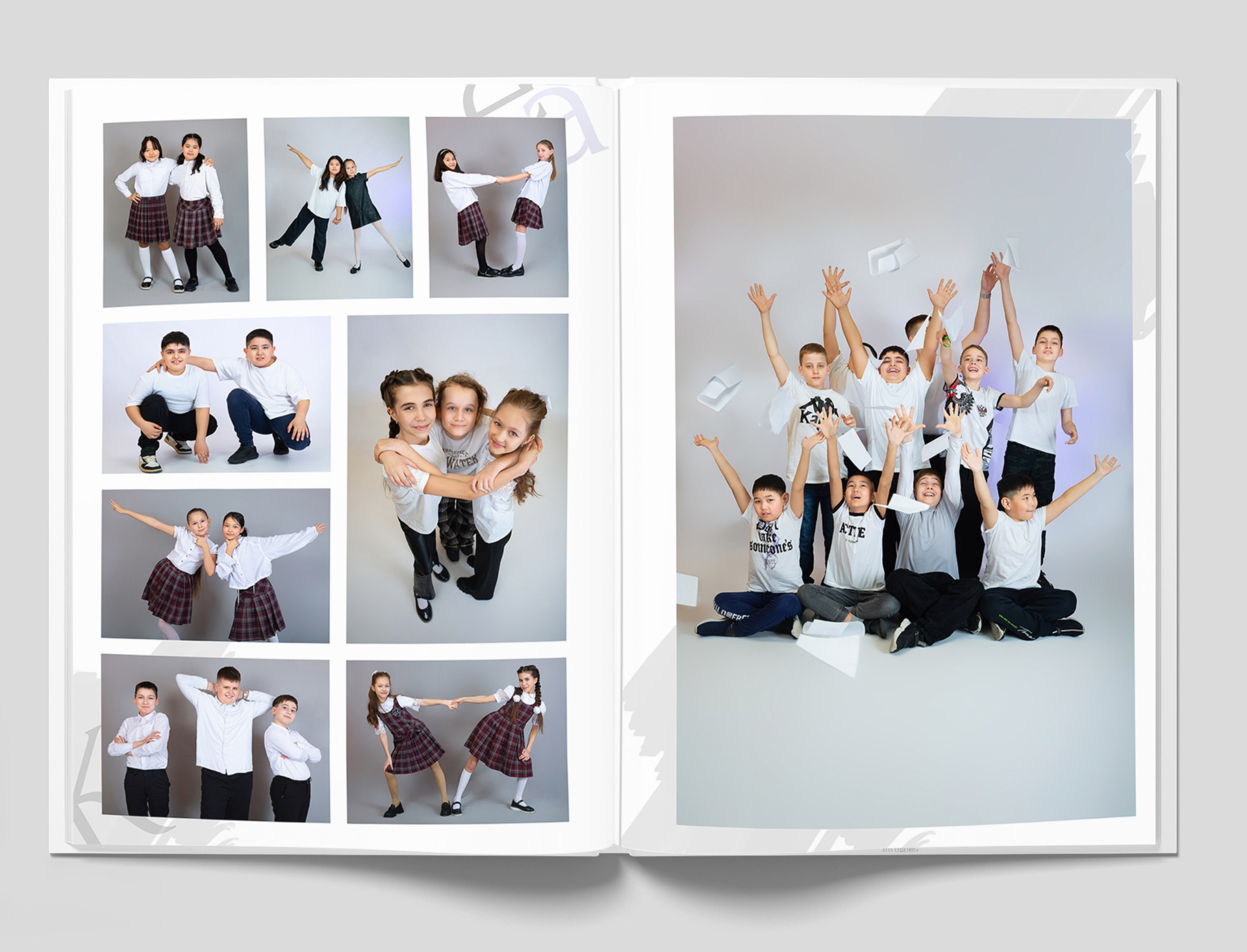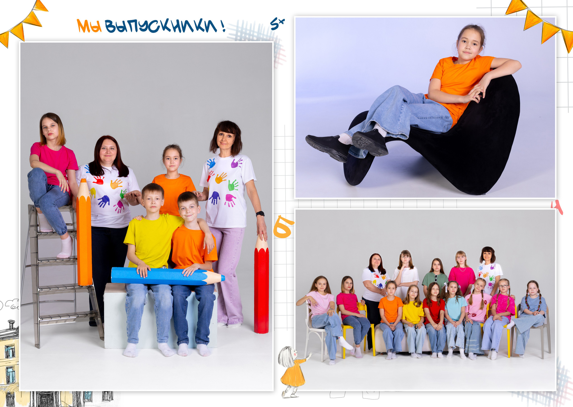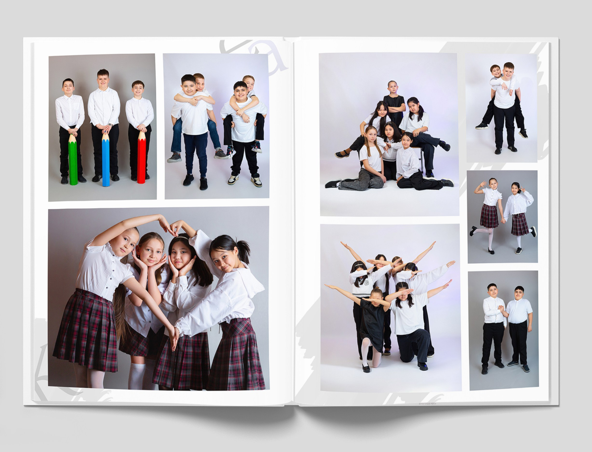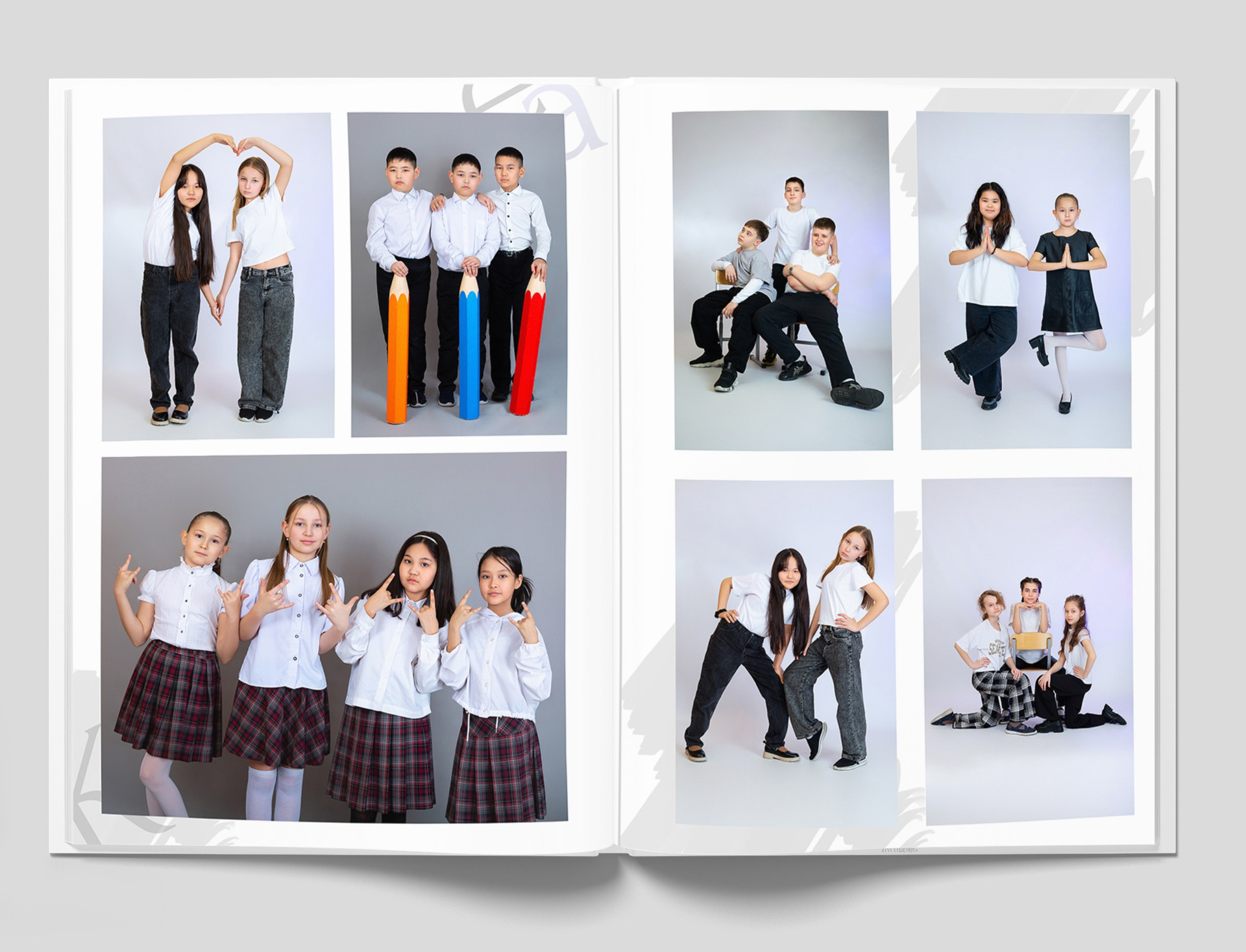 Все внутренние развороты оформлены портретами детей класса с подписью имен + коллажи фотографий сюжетов, снятых на студийной фотозоне, в студии или прямо в классе.