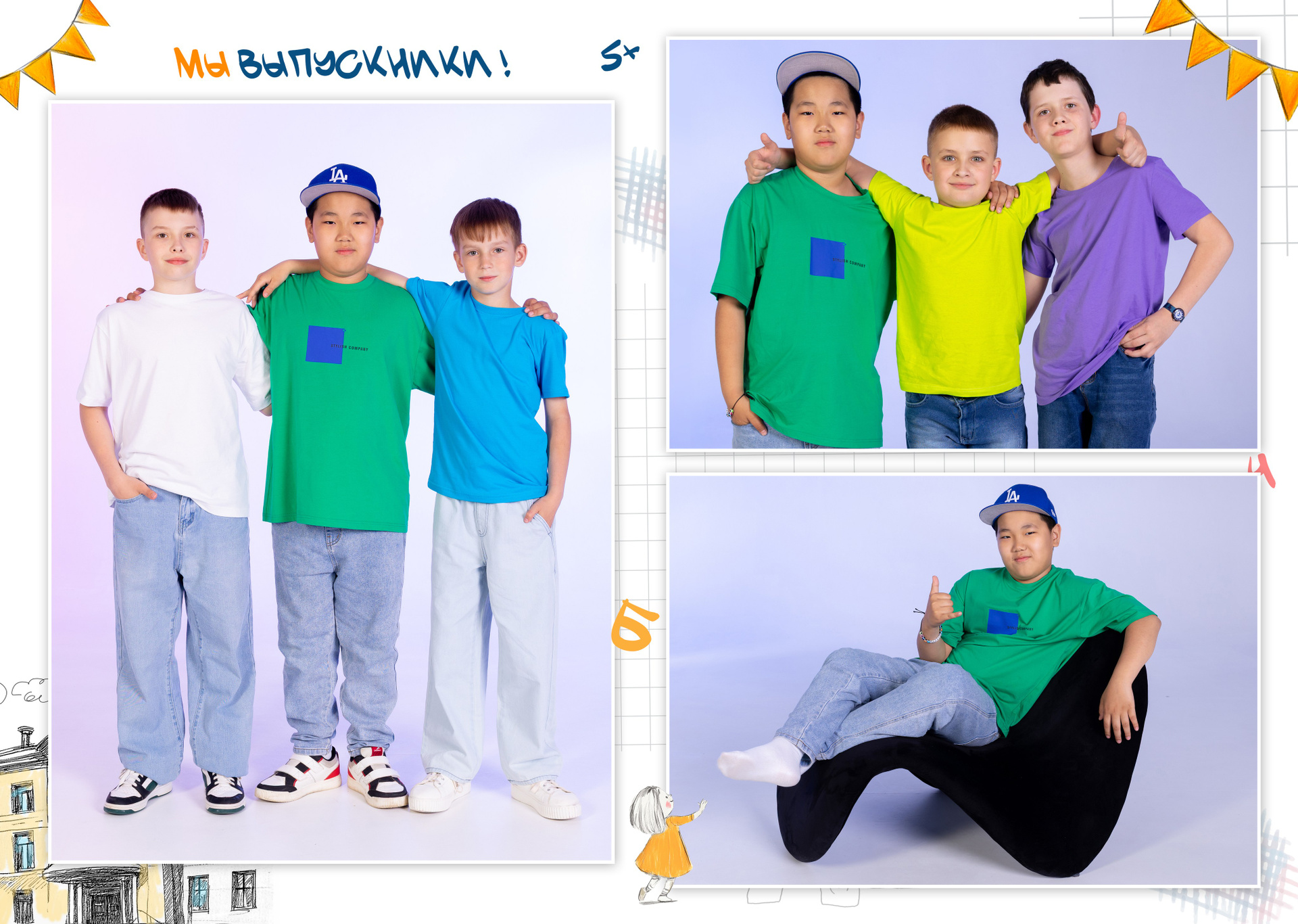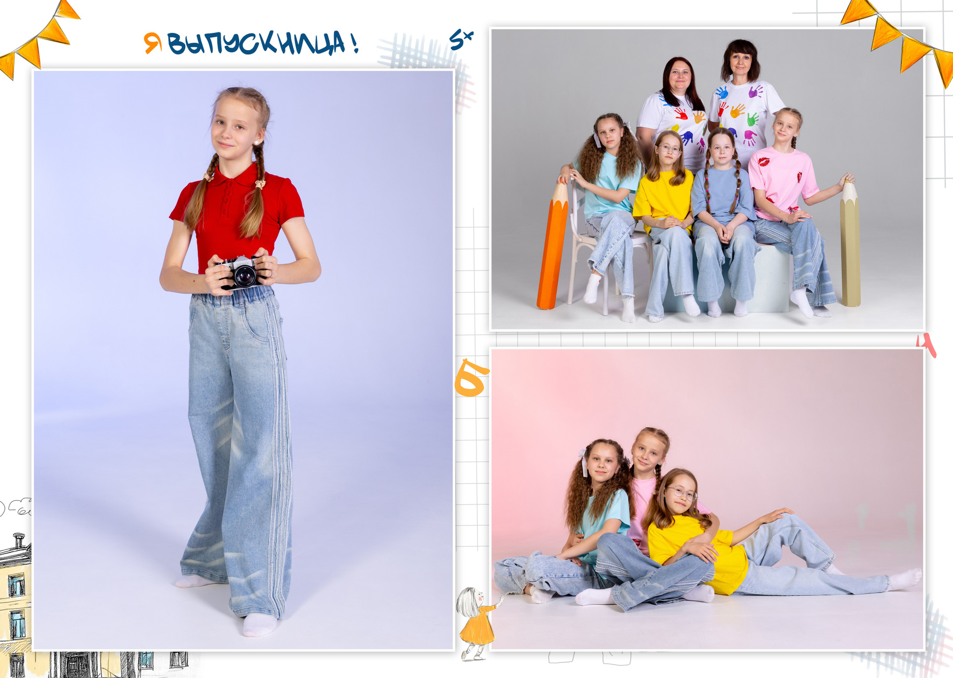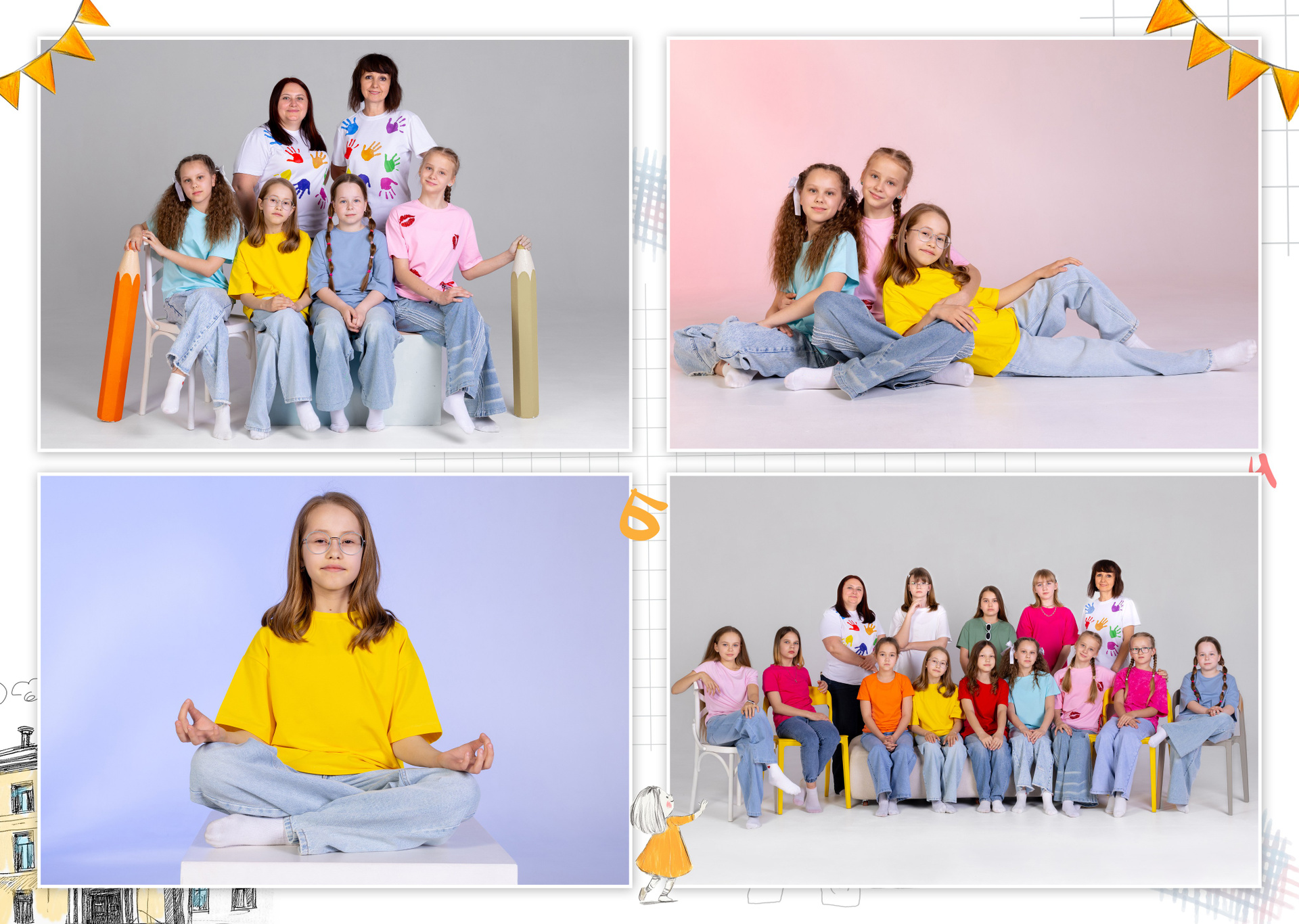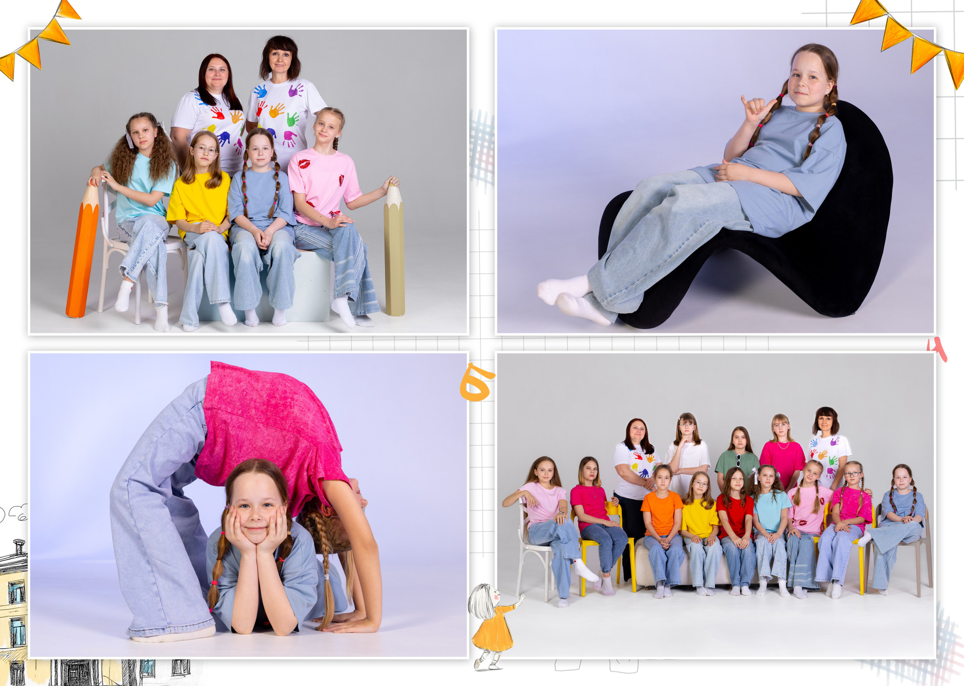 Все внутренние развороты оформлены портретами детей класса с подписью имен + коллажи фотографий сюжетов, снятых на студийной фотозоне, в студии или прямо в классе.