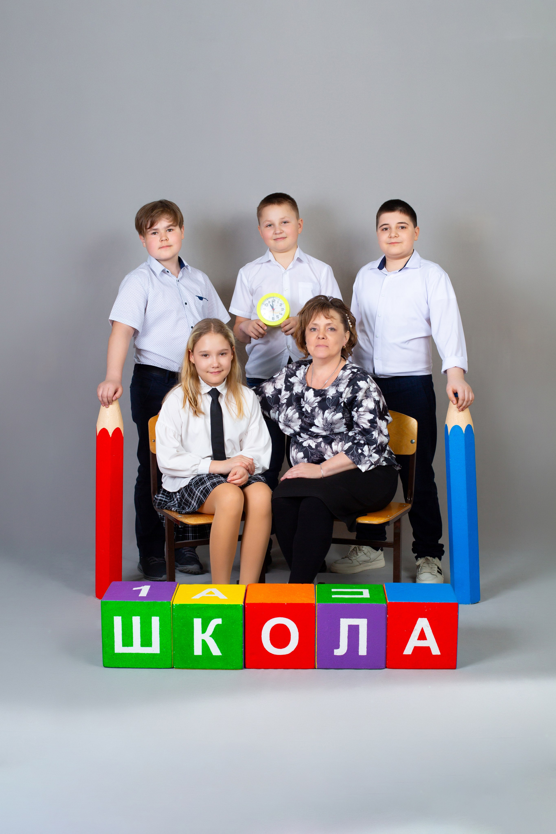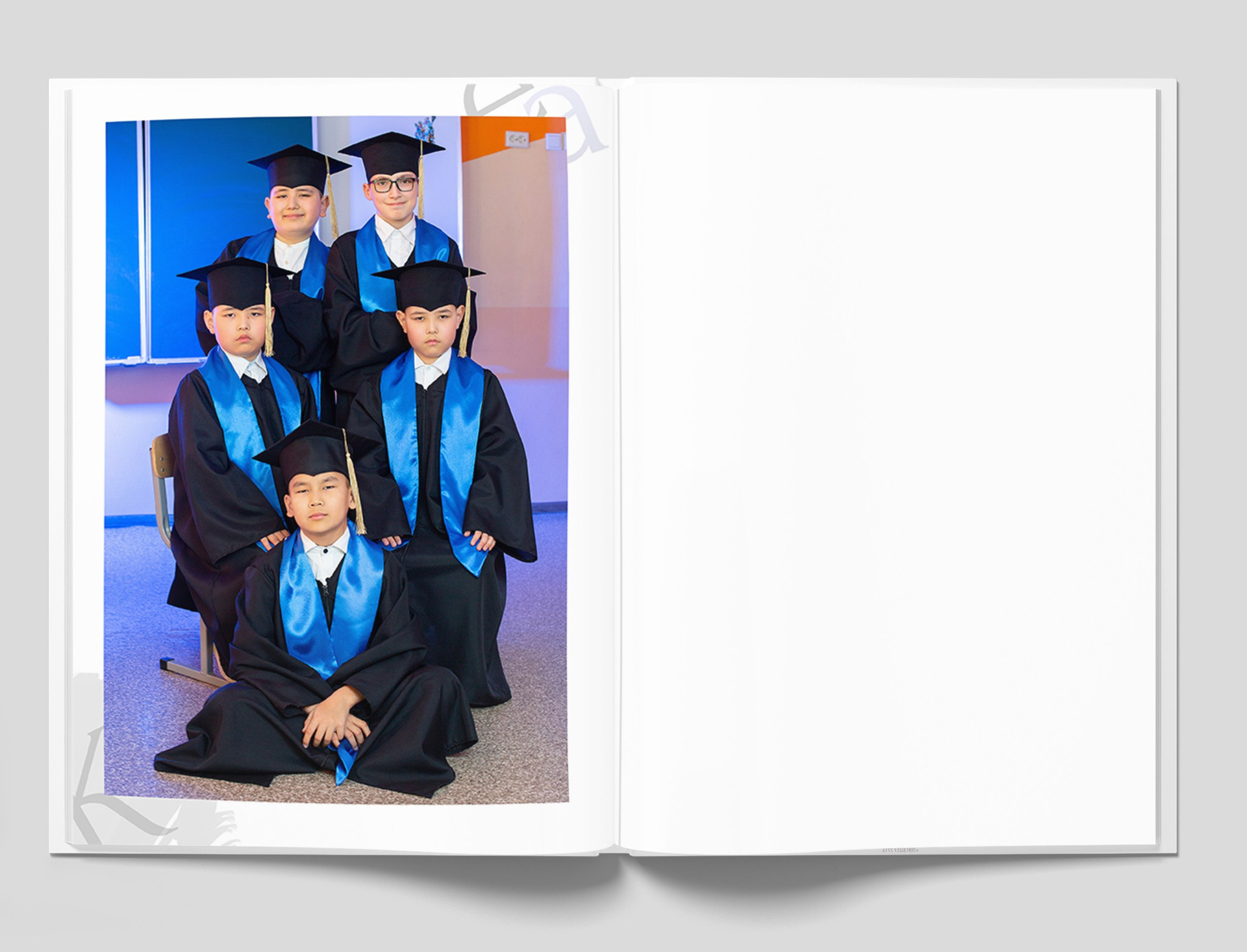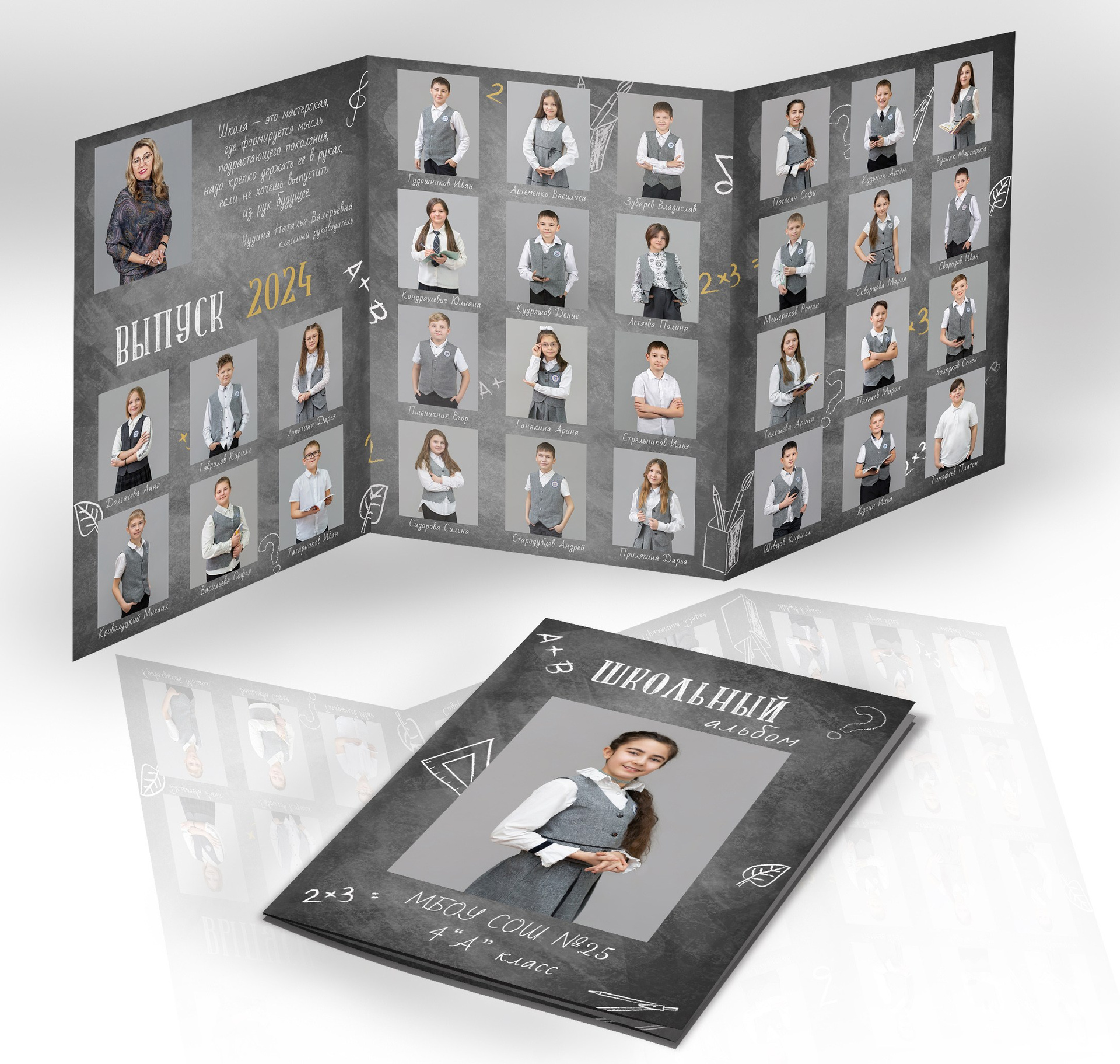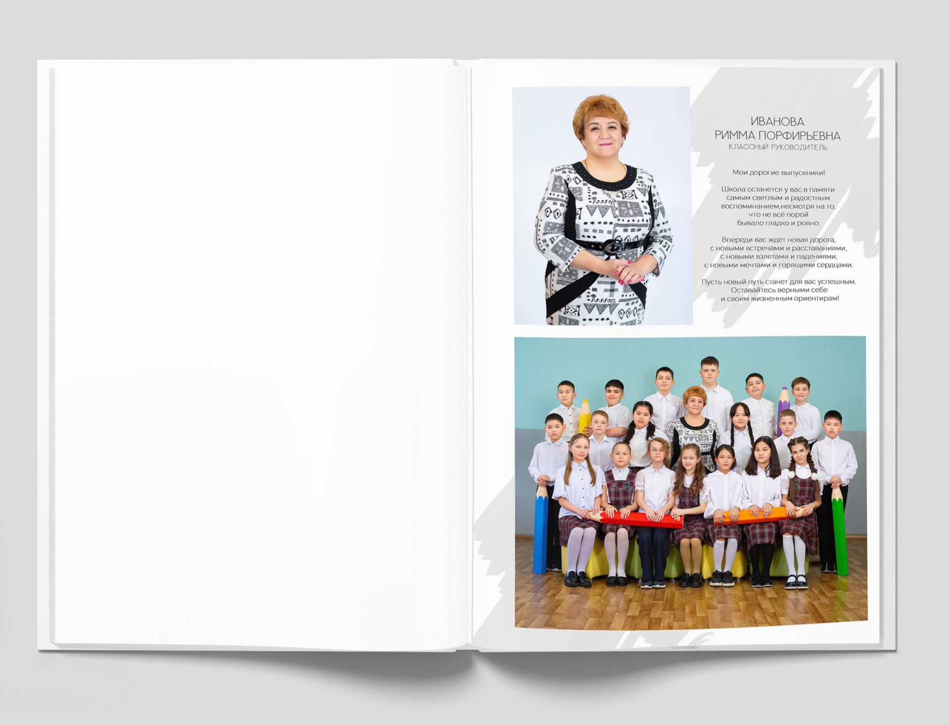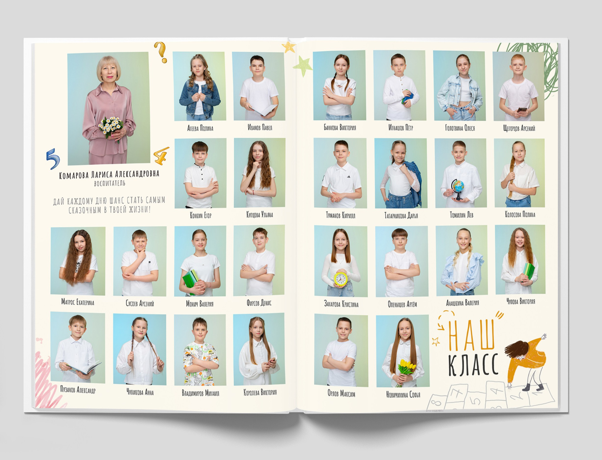 1 разворот: индивидуальная фотография ребенка в компании лучших друзей, общая фотография класса + портрет педагога (педагогов).