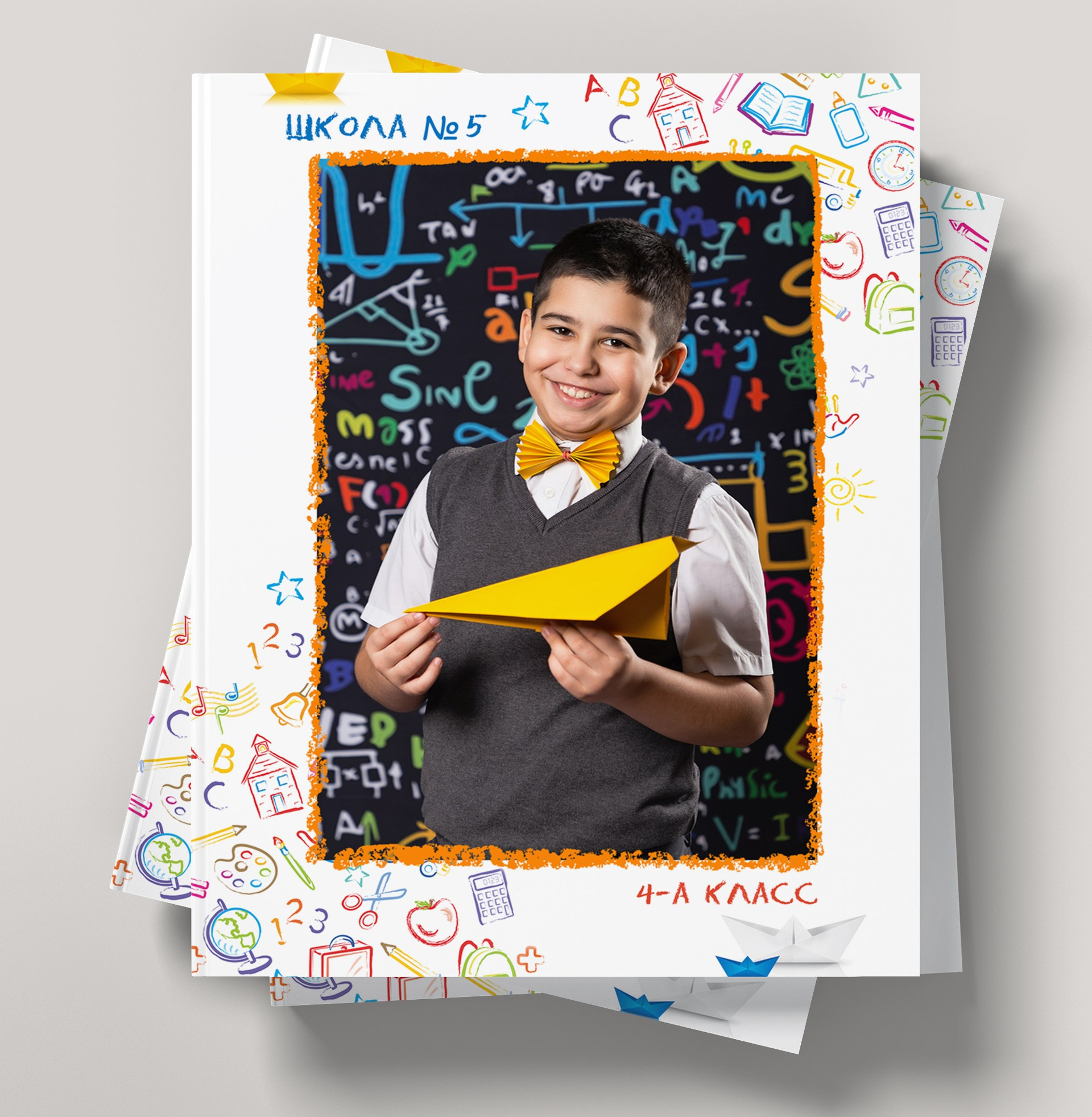 На обложке расположен коллаж фотографий всего коллектива класса — это фотографии детей группками, в которых каждый ребенок участвует равное количество раз и каждый ребенок есть на фото ровно столько же сколько и другие дети. Обложка одинаковая у всех, кроме персональной фотографии на титульнике.