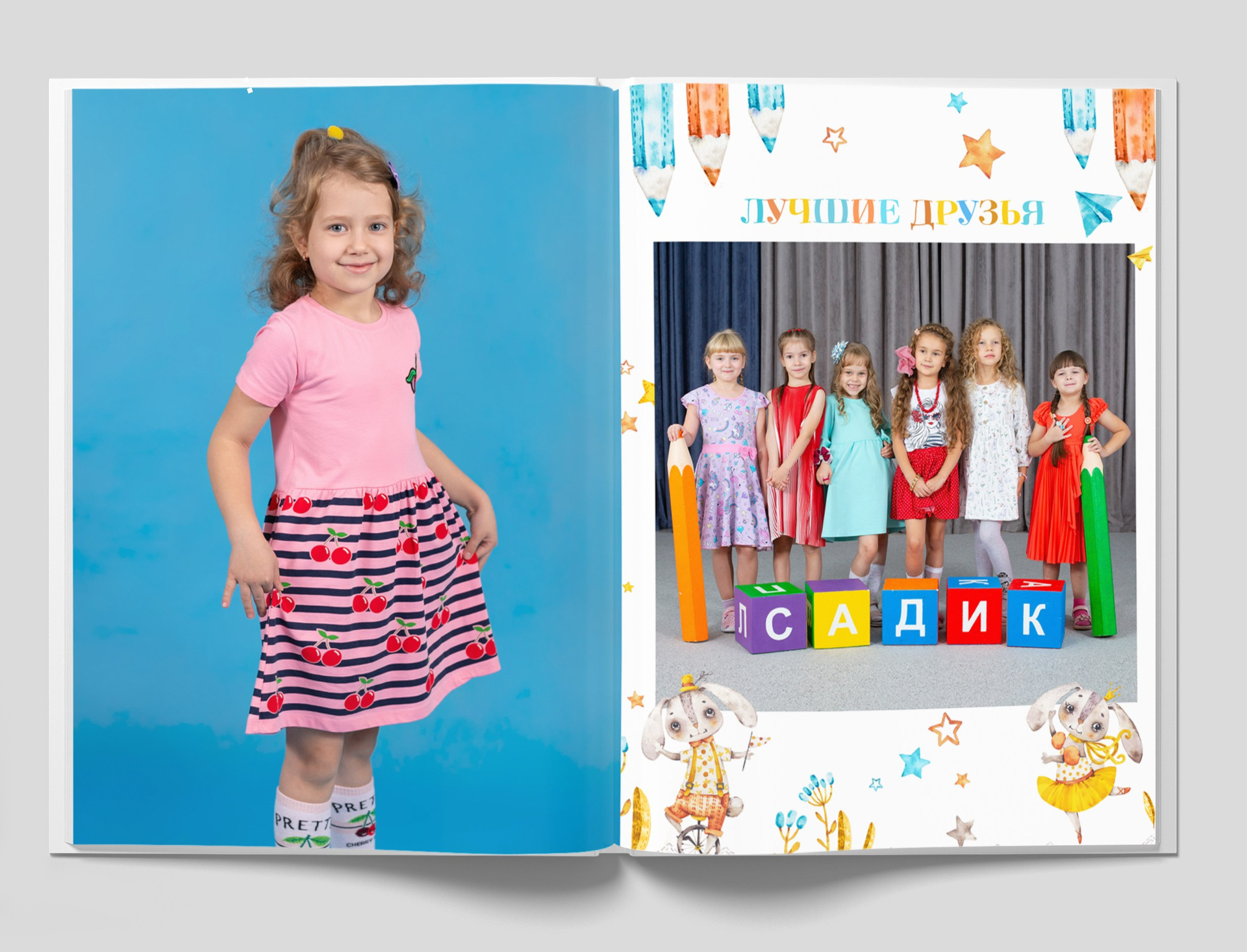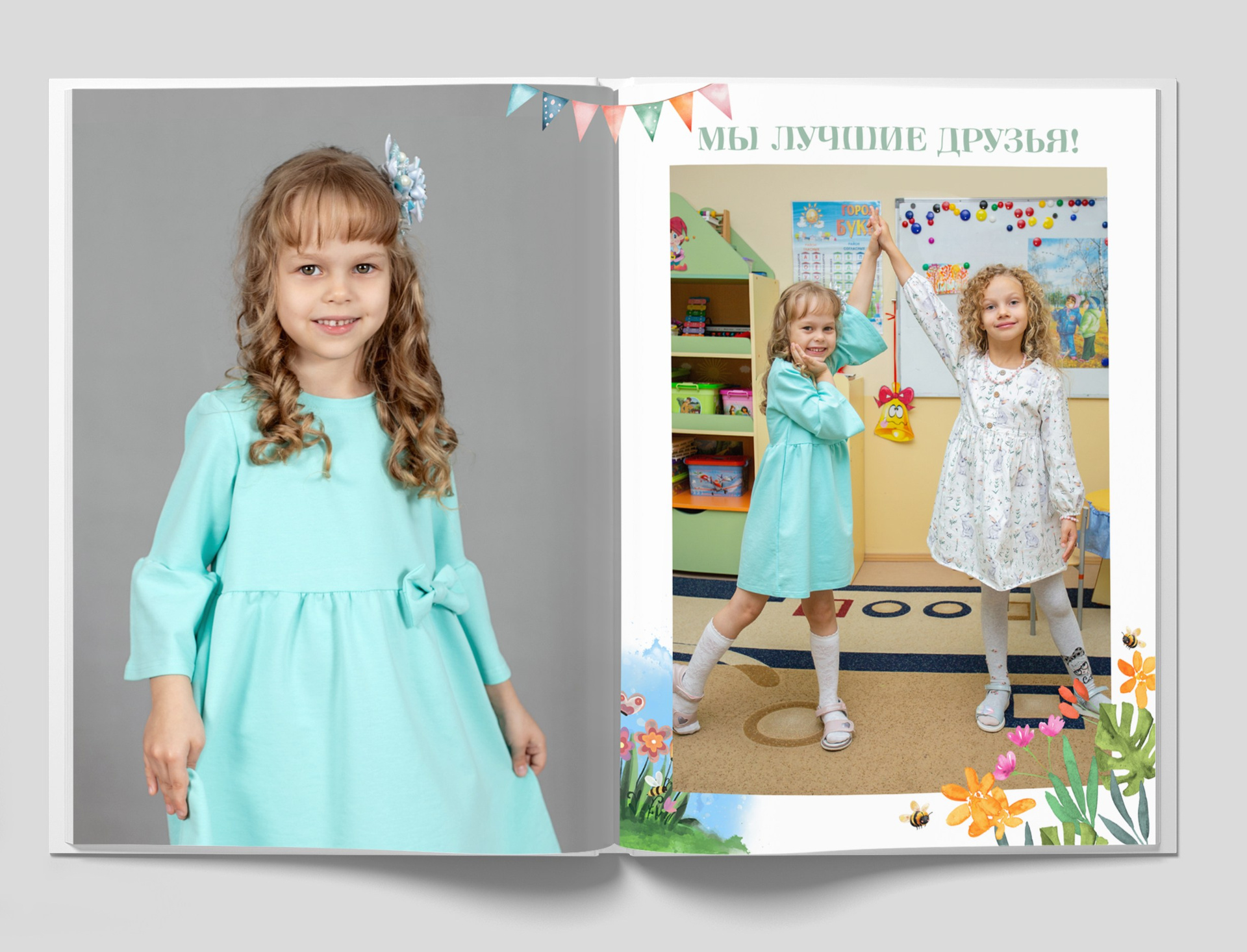 1 разворот: портрет ребенка + портрет ребенка в компании лучшего друга/друзей.