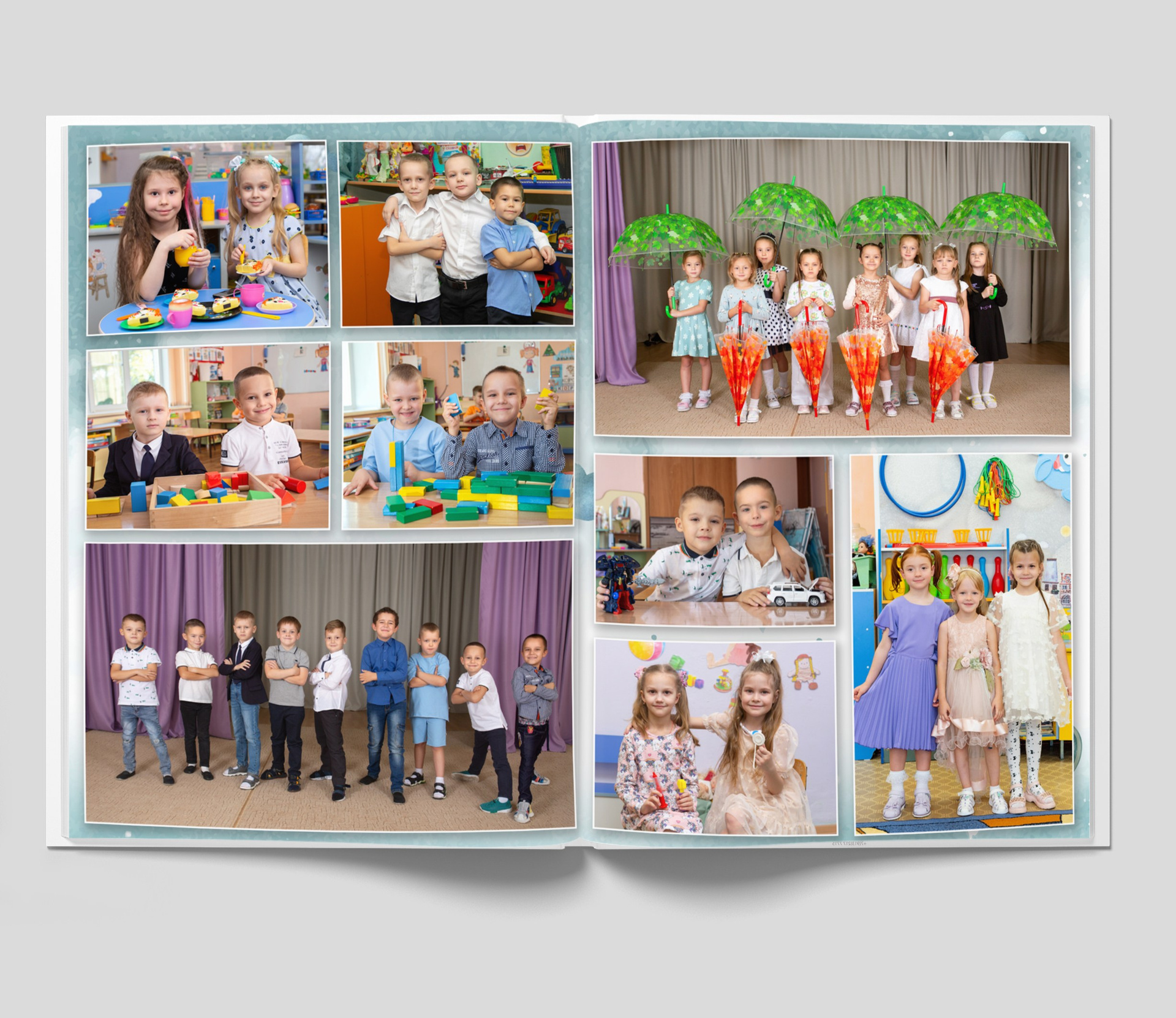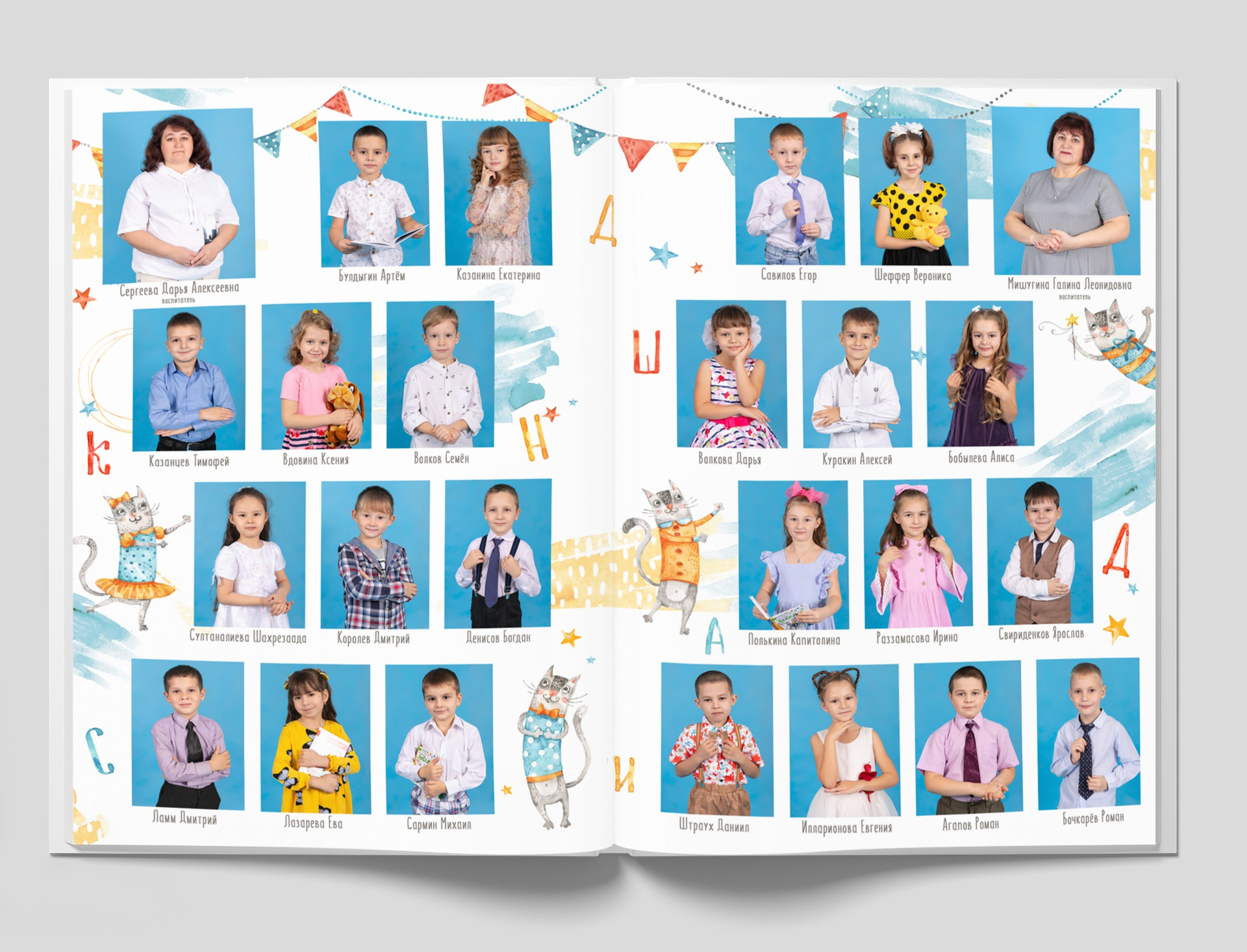 Работа ведется по списку коллектива, поэтому альбомы с общими разворотами содержат равное количество фотографий конкретного ребенка.