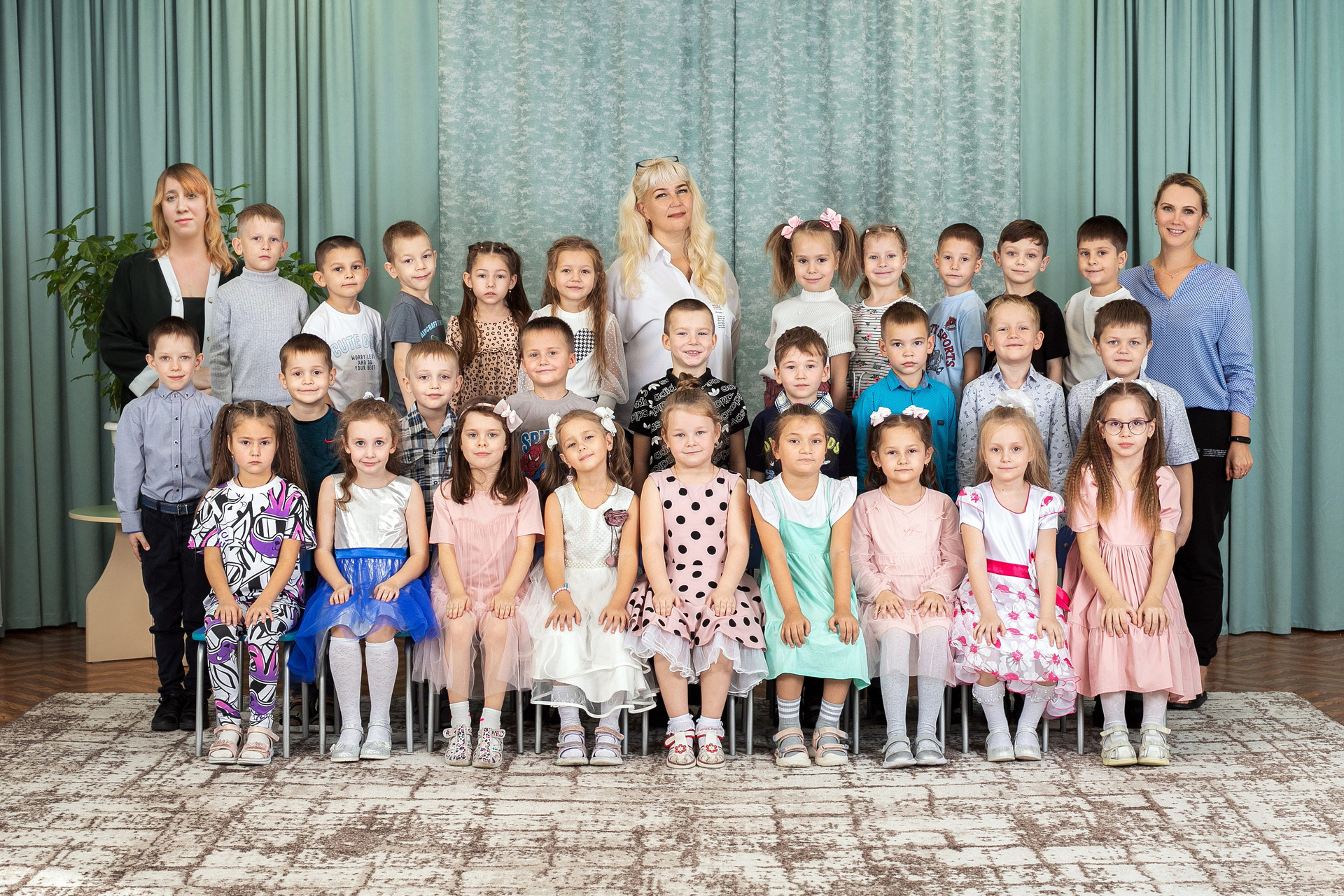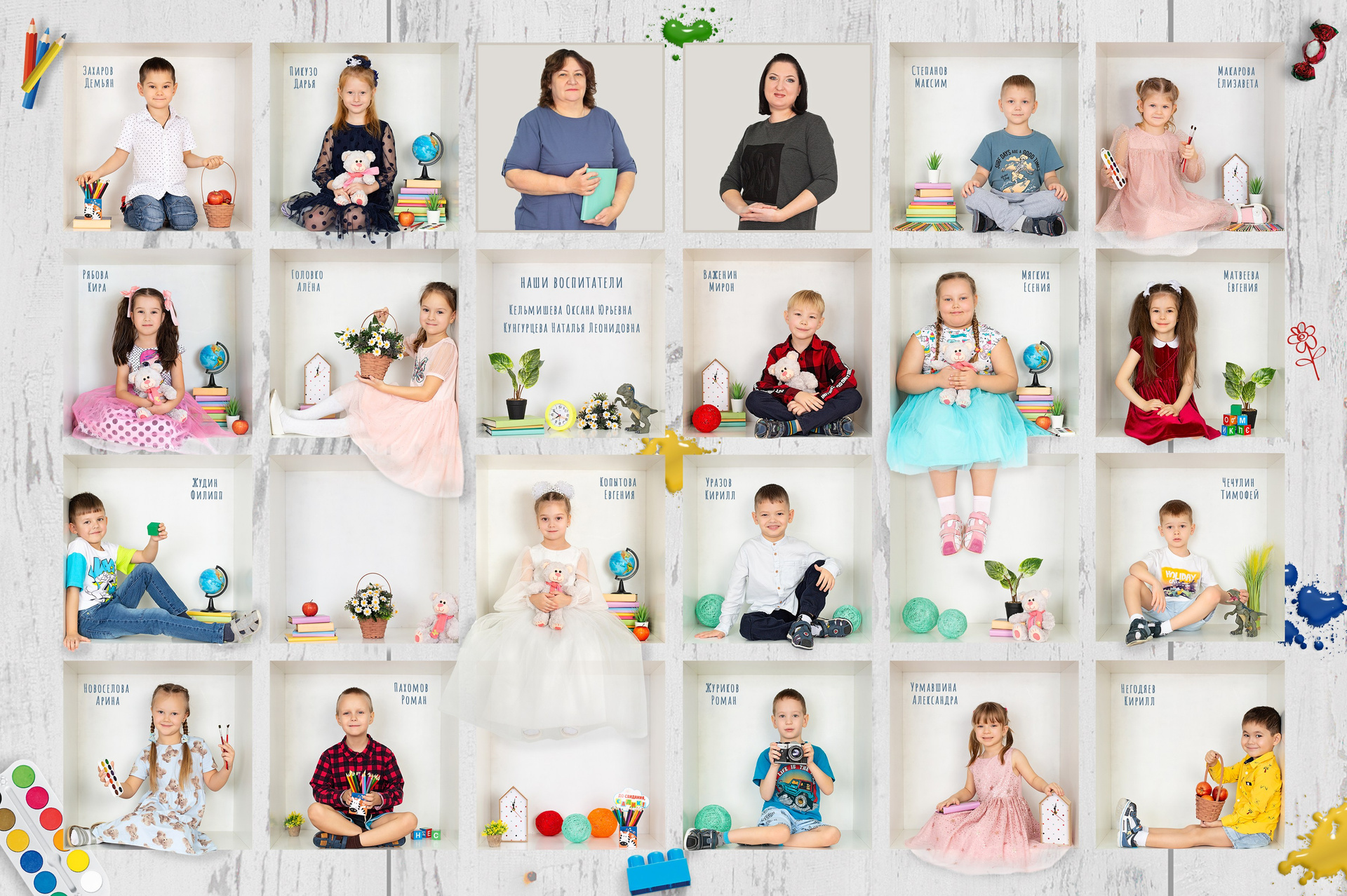 Портреты педагогов, коллективная фотография «Общая» и коллаж из фото детей группками.