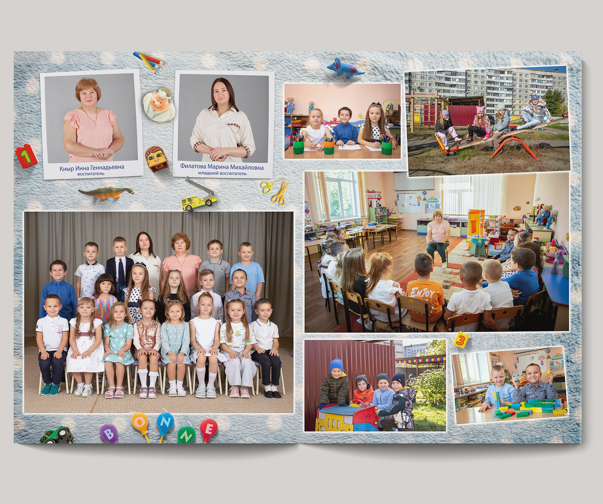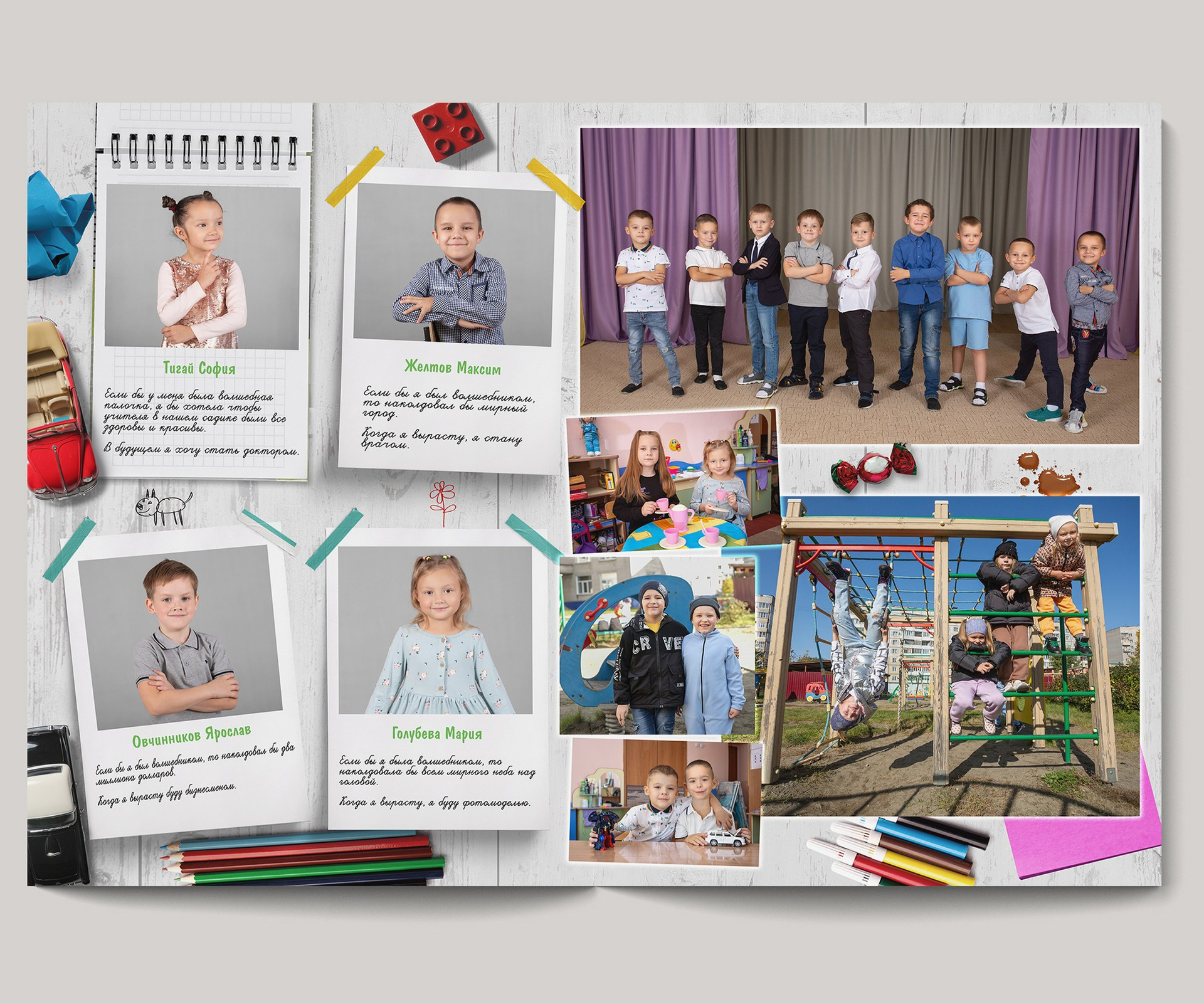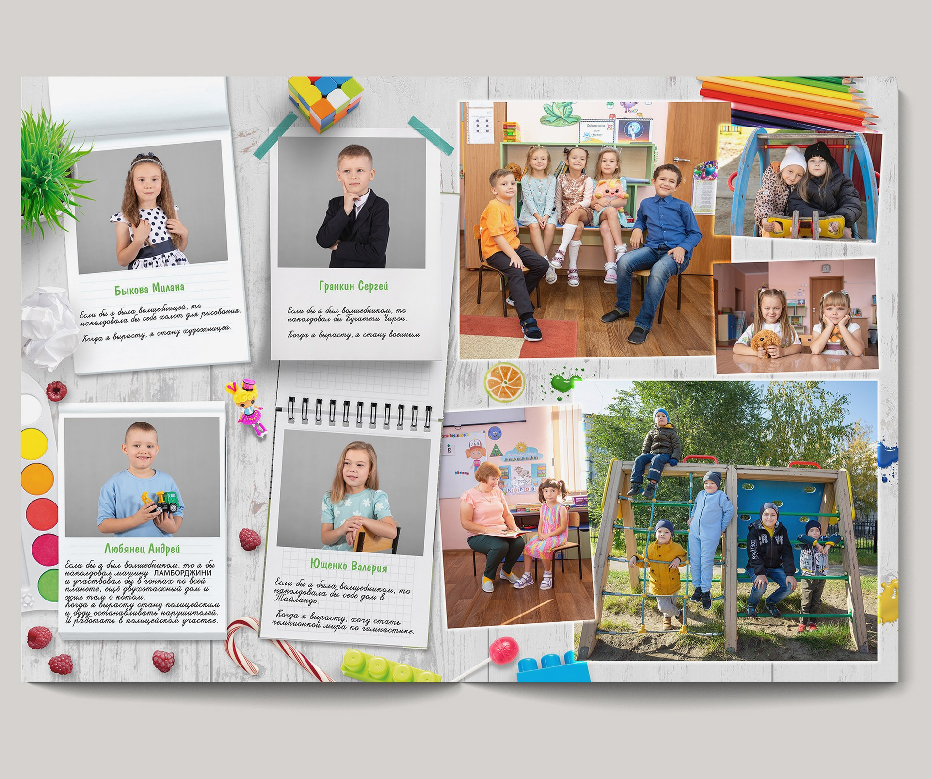 2 разворот: Портрет каждого ребенка + его интервью, коллаж фотографий о жизни детей в садике.