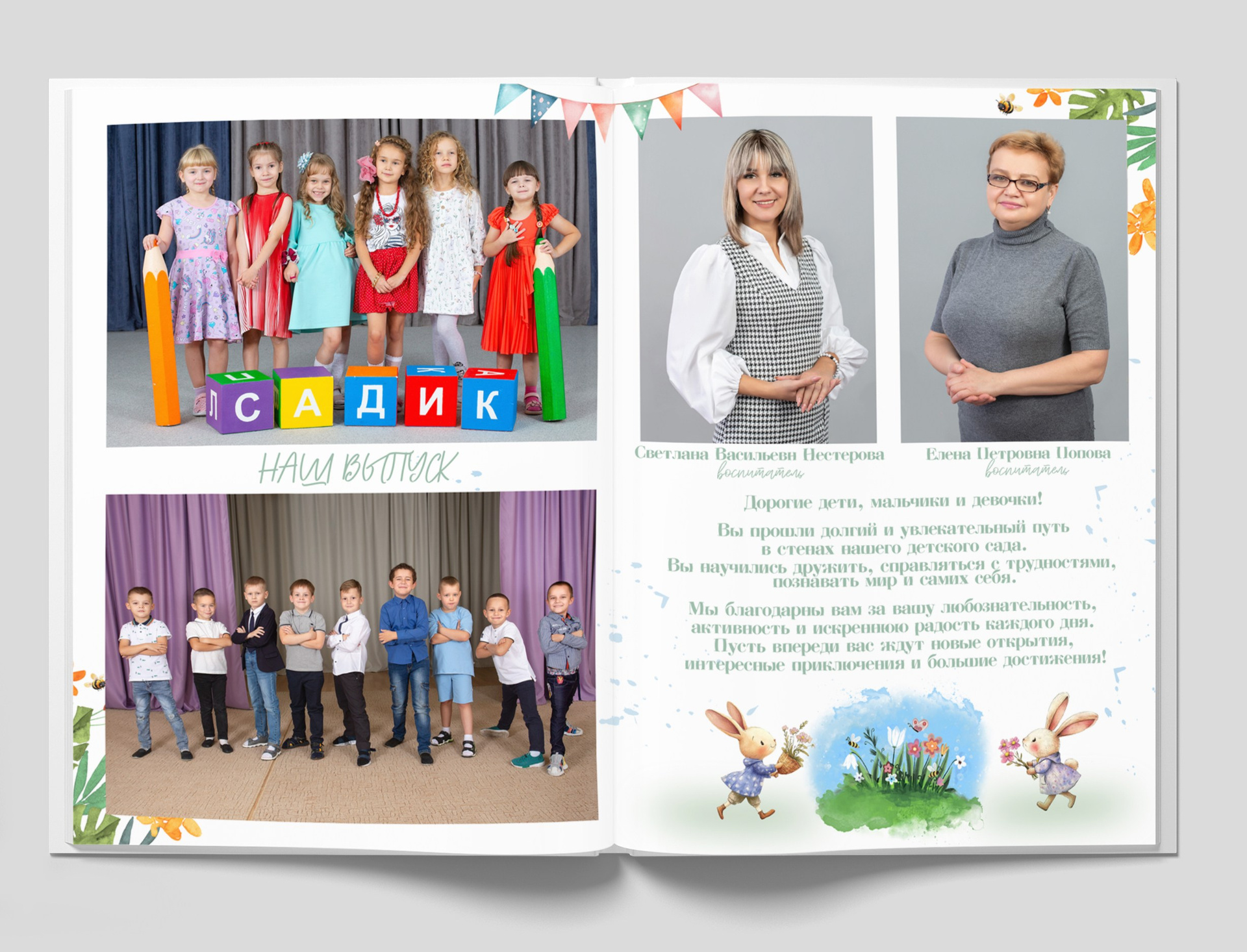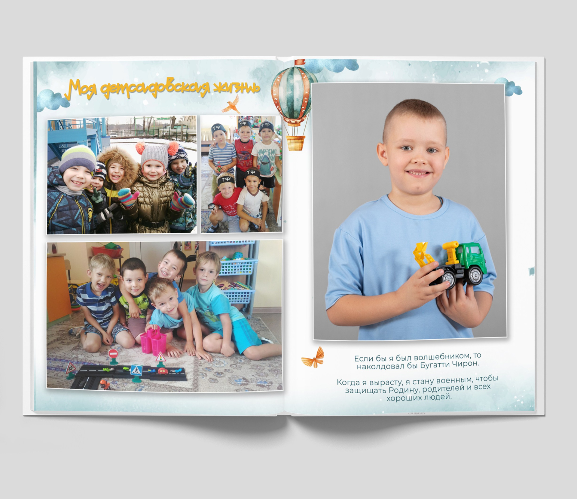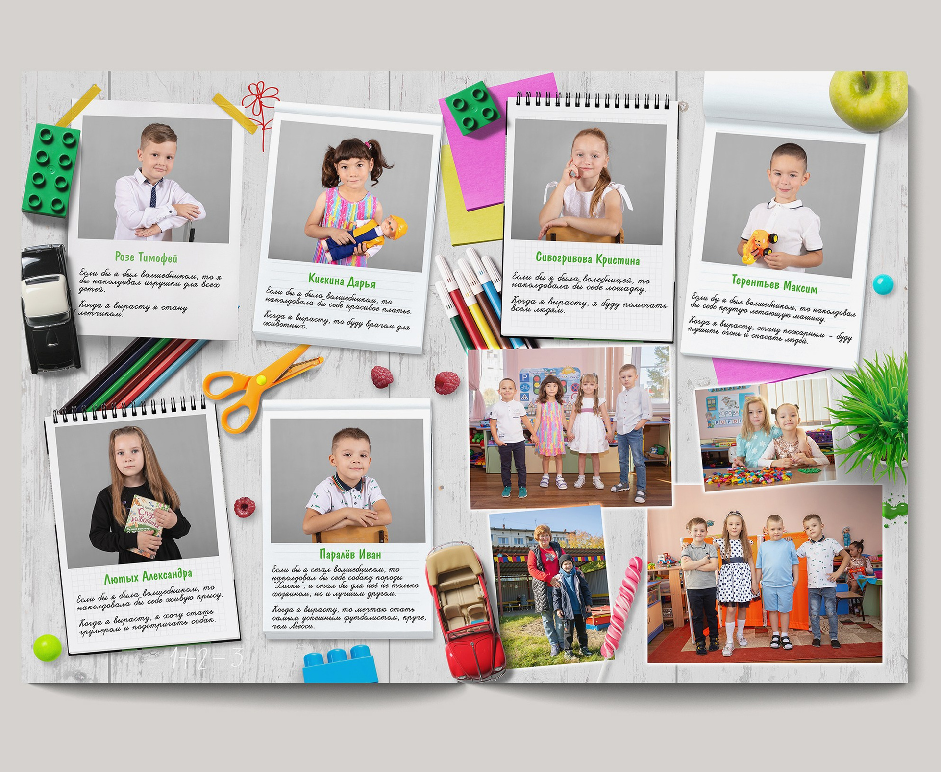 2 разворот: Портрет каждого ребенка + его интервью, коллаж фотографий о жизни детей в садике.