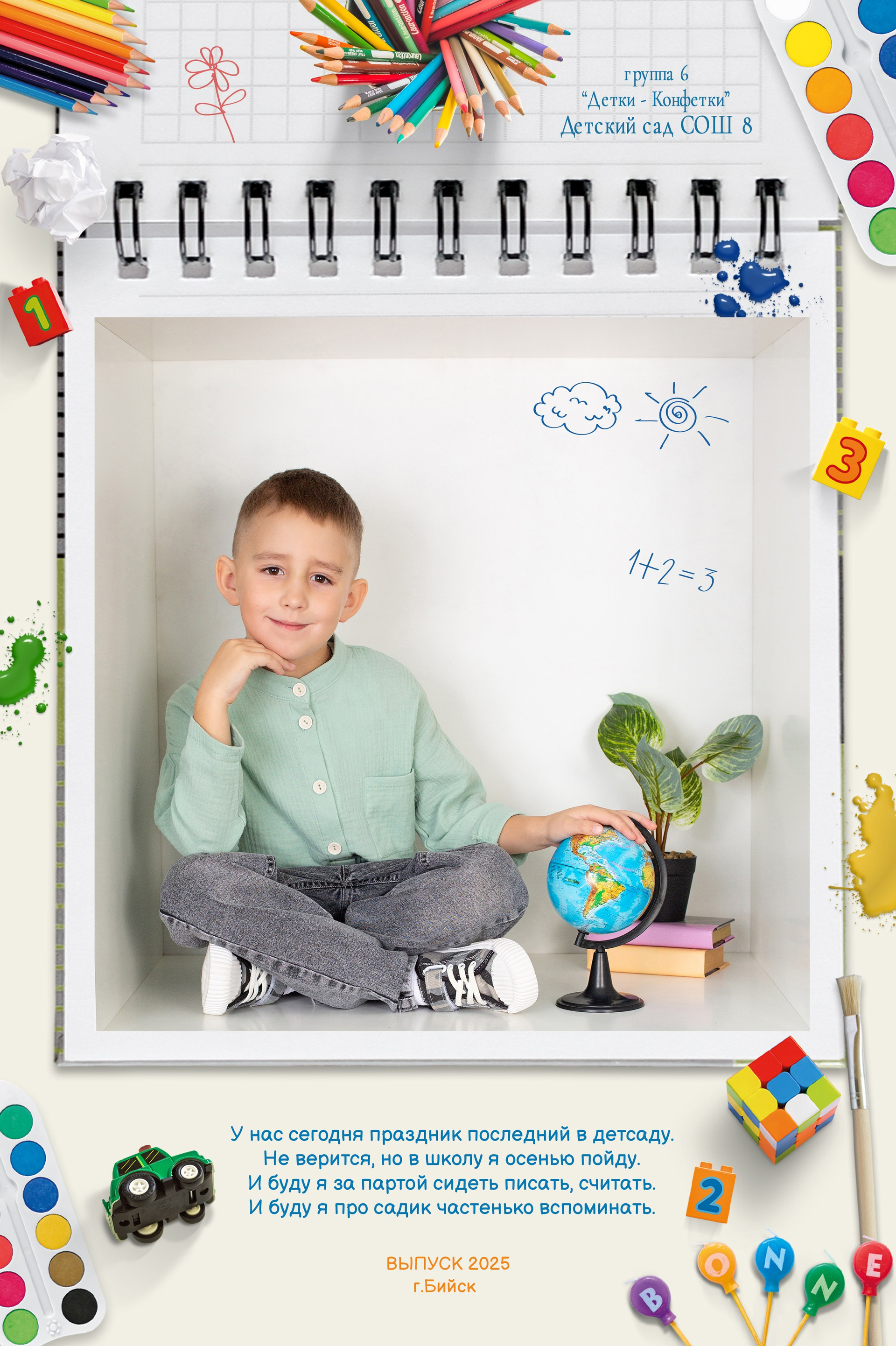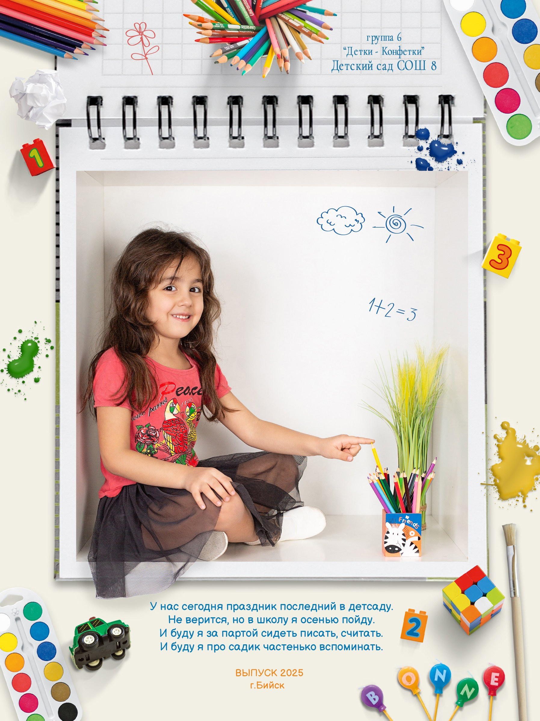 1 разворот: фото с прошлых лет, интервью ребенка и его фото, отличающееся от обложки. Разворот индивидуален у каждого ребенка.