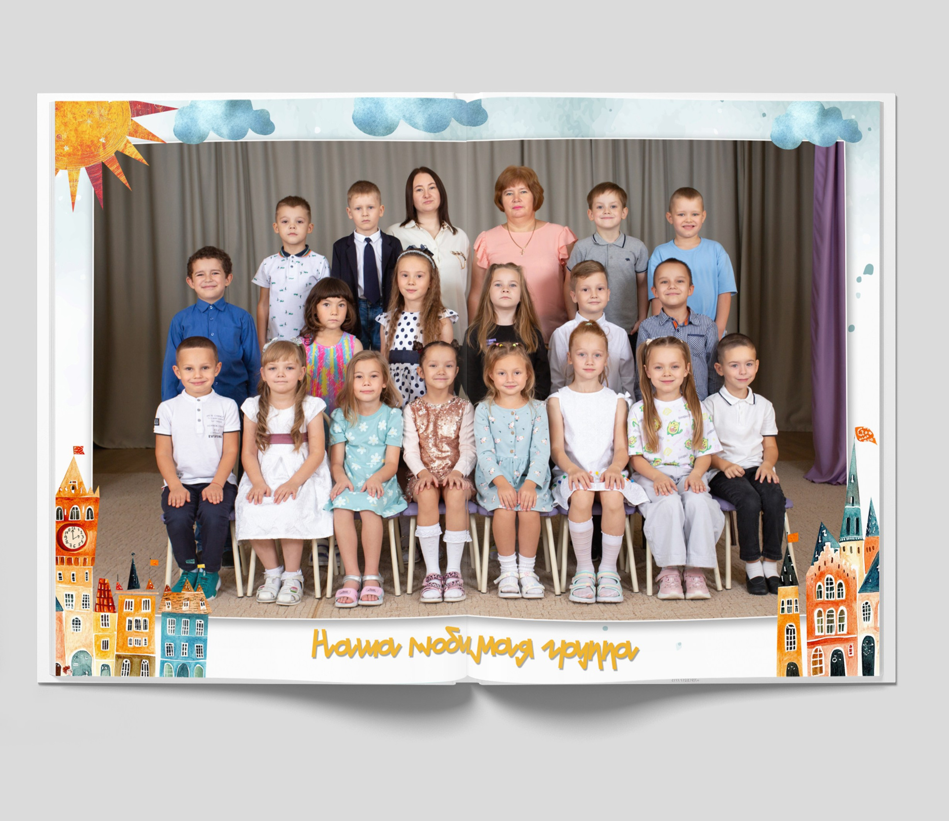 2 разворот: «Виньетка» коллектива, все дети подписаны по именам. Разворот одинаковый у всех.