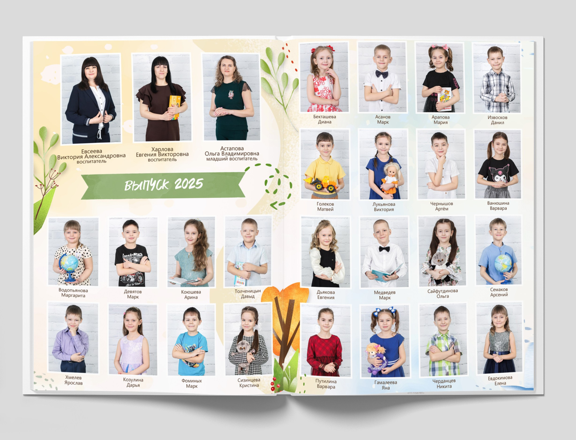 Портрет вашего ребенка на всю страницу (отличающееся от фото на обложке), справа все дети портретно оформленные в формате «Виньетки».