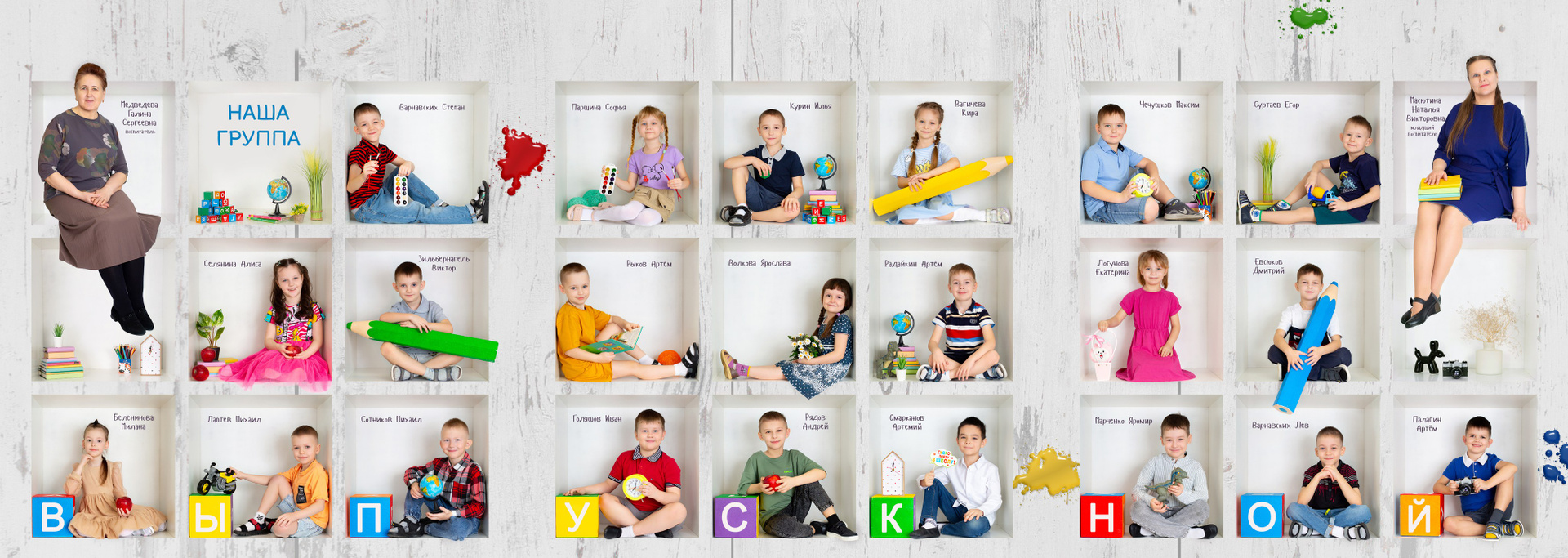 Внутренний разворот трюмо: все дети индивидуально сидят каждый в своем кубике, подписанные по именам.