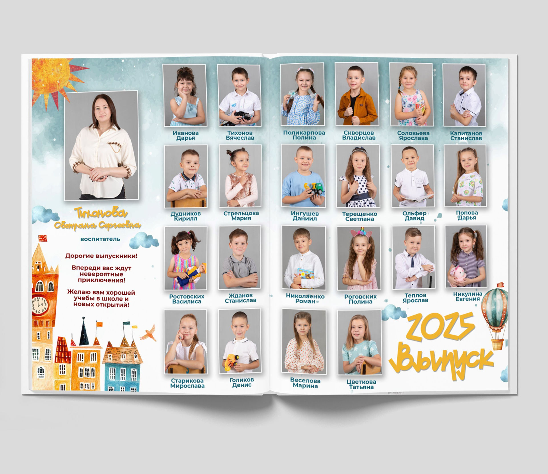 На внутреннем развороте портрет каждого ребенка, подписанные по именам.