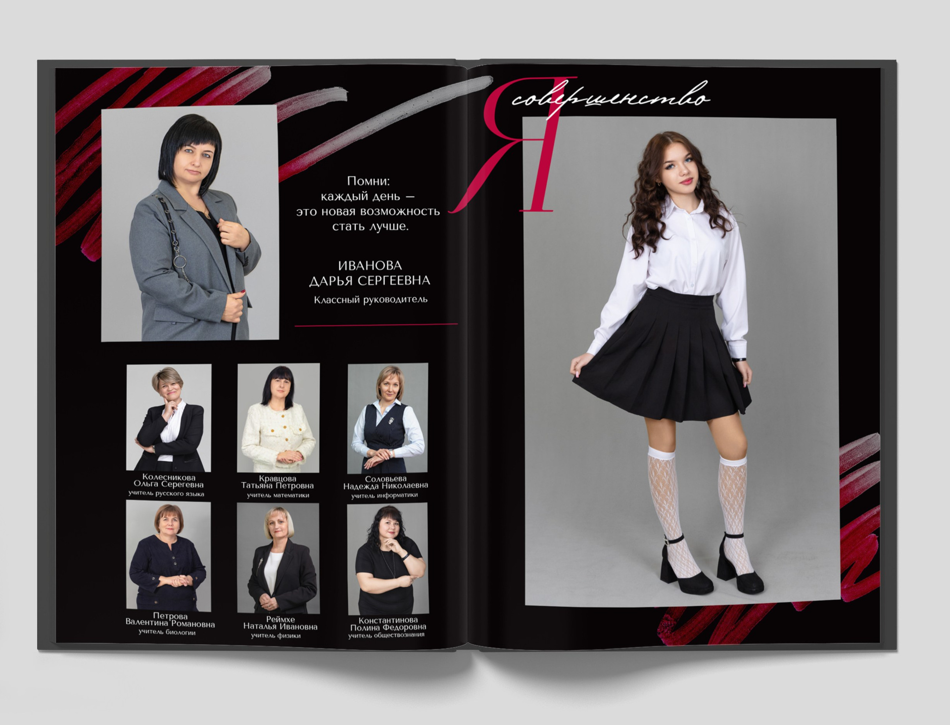 1 разворот: портрет педагога (или педагогов несколько), крупная фотография ребенка (на всю страницу).