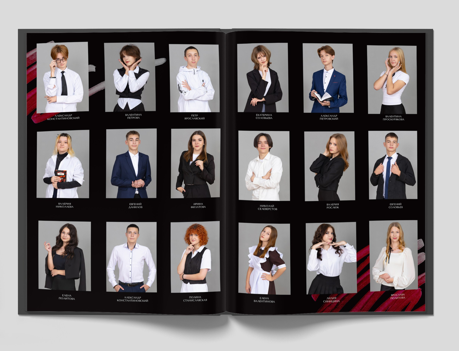 На внутреннем развороте портрет каждого ребенка, подписанные по именам + большой портрет ребенка (отличающийся от портрета на обложке).