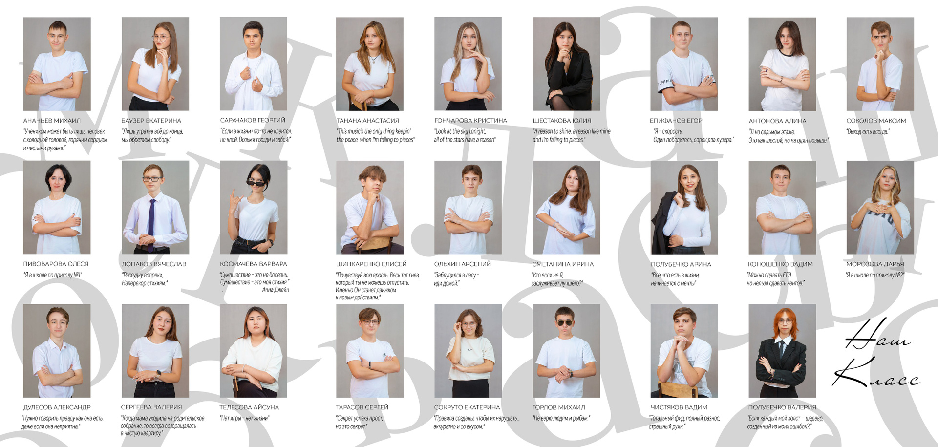 На внутреннем развороте портрет каждого ребенка, подписанные по именам + жизнеутверждающие фразы (каждый ребенок пишет свою фразу сам).